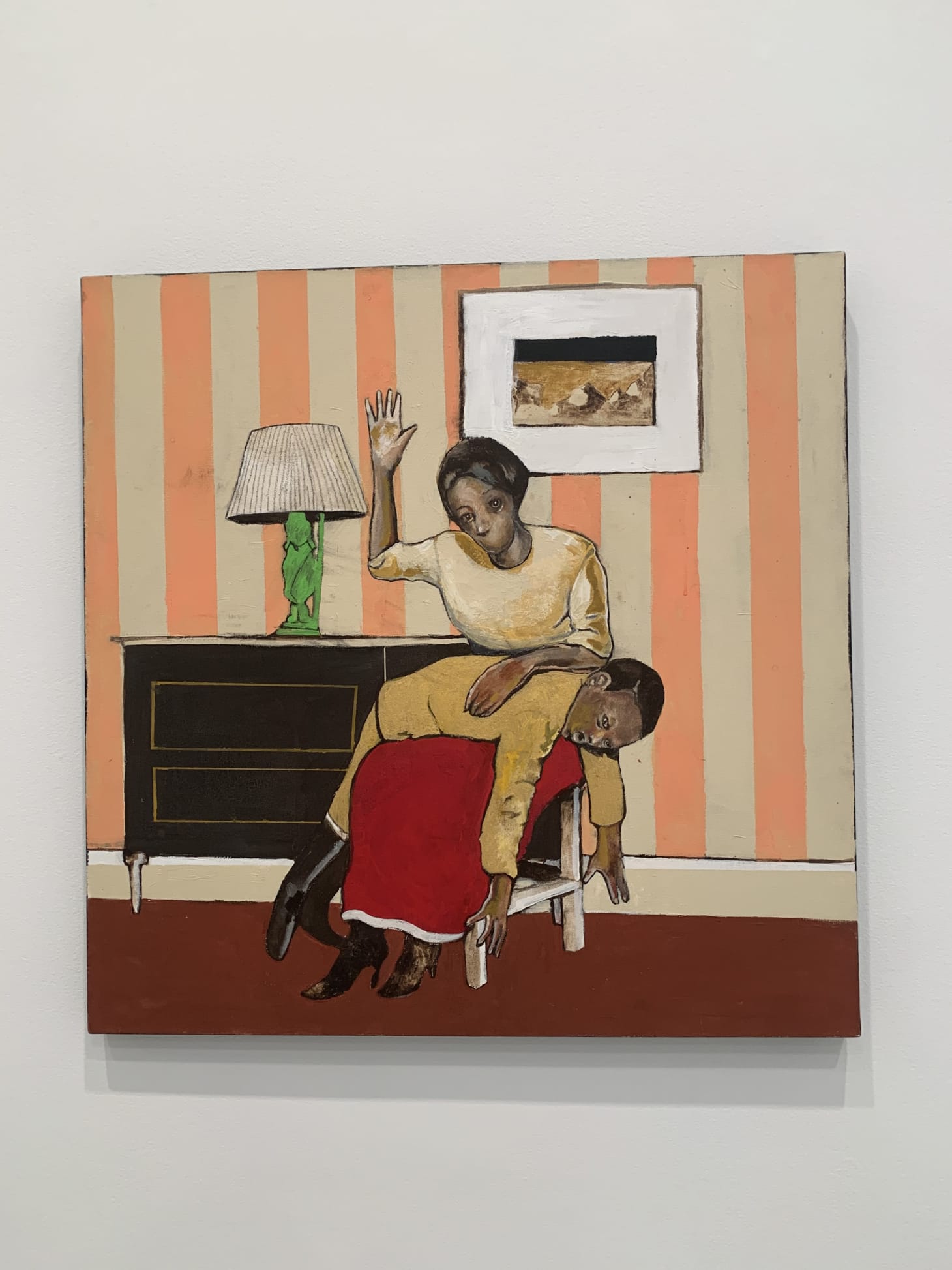 Often compared to that of Luc Tuymans, Henry Taylor, and Marlene Dumas, Davis’s style eludes such easy descriptors. Characterized by moody purples, greens, rich browns, and inky blacks, often applied in a dry technique, Davis’s body of work sits in a class all its own, deeply rooted as it is in the particularities of a uniquely Black vision of the mundane. In a smaller, square painting from 2007, cheekily titled “Bad Boy for Life” (2007), Davis renders a familiar domestic scene of a young Black boy bent over his mother’s lap. Here, we enter the moment before a spanking. The child’s arms are outstretched rigidly, tensed in anticipation of the inevitable blow, while his mother looks straight back at the viewer, hand raised above him. Eyes wide, she has no mouth, only a bulging cheek highlighted in a cream tone that matches the striped wallpaper behind her. Her partial expression refuses guilt or indignation over her task. She is simply doing it, and letting us know she sees us seeing her.