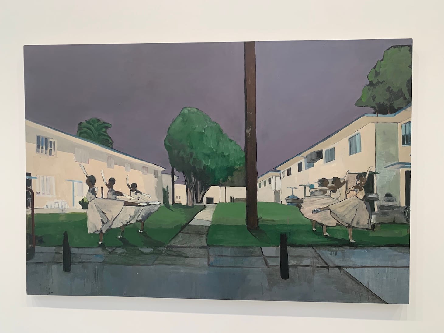 Later, I find myself moving slowly, back and forth, between two paintings from Davis’s Pueblo del Rio series, “Concerto” and “Arabesque” (both 2014). A lush purple sky — the ominous color of LA smog — frames the titular south LA housing project co-designed by revered but under-recognized Black architect Paul R. Williams, a major source of inspiration for Davis. In Davis’s version of this urban landscape, Black ballerinas stretch gracefully, framing each side of a building block, while in the neighboring composition, a Black pianist plays the keys in deserted intersection. Faceless, the figures again deny the dynamics of the gaze; their worlds contain a quiet solace, absorbing but impenetrable.