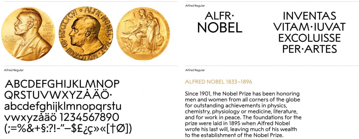 This December, to coincide with its 2018 ceremony, the Nobel Prize introduced its new design by the Sweden-based Stockholm Design Lab as a way to integrate the various stakeholders within the organization under one holistic brand identity. As the Stockholm Design Lab states on its project page, the new logo is meant “to create synergies.” Accordingly, the design firm has adapted its new font from text on the prized Nobel medal. They then based its uppercase lettering on classic geometric shapes and the lowercase letters on tradition — early typefaces like Akzidenz-Grotesk, Berthold Grotesk, and Futura.