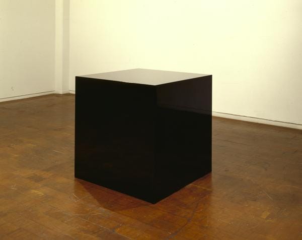 At some point, while looking at “Phase of Nothingness–Water,” I began thinking about another steel container filled with liquid, “Ink Box” (1986) by Charles Ray. “Ink Box” is a glossy black cube that stands three feet high and is filled to the brim with viscous black printer’s ink. The barely perceptible difference between the sculpture’s steel walls and the surface of the similarly colored printer’s ink makes the viewer’s encounter with it into a visual one. By filling the box with an opaque substance, ink, Ray wittily undermines Stella’s terse credo, “What you see is what you see.” But is it enough to undermine a moribund aesthetic if, by emphasizing the visual, you are at the same time paying homage to it?