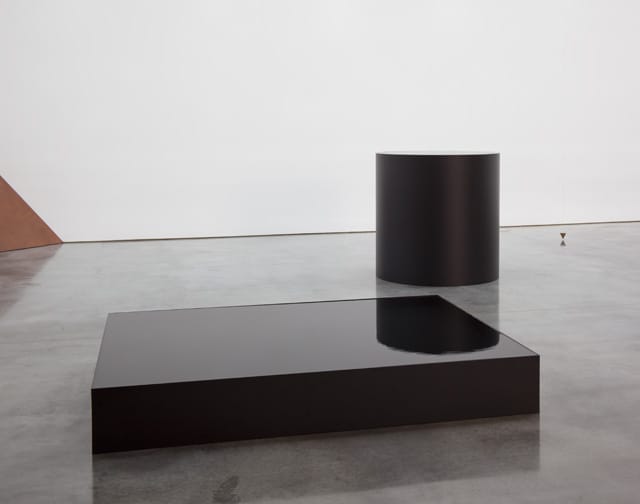 It was two distinct things, which I could not make into one, and this duality underscores the use of two materials, steel and water. One part is a black lacquered steel cylinder filled with water, while the other is a black lacquered, steel rectangle filled with water. The cylinder reminded me of a cistern, while the rectangle brought to mind a trough. High overhead, the air conditioning unit blew cold air into the room, with the breeze slightly ruffling the water’s surfaces in both parts. The lights in the ceiling were reflected in the black water.