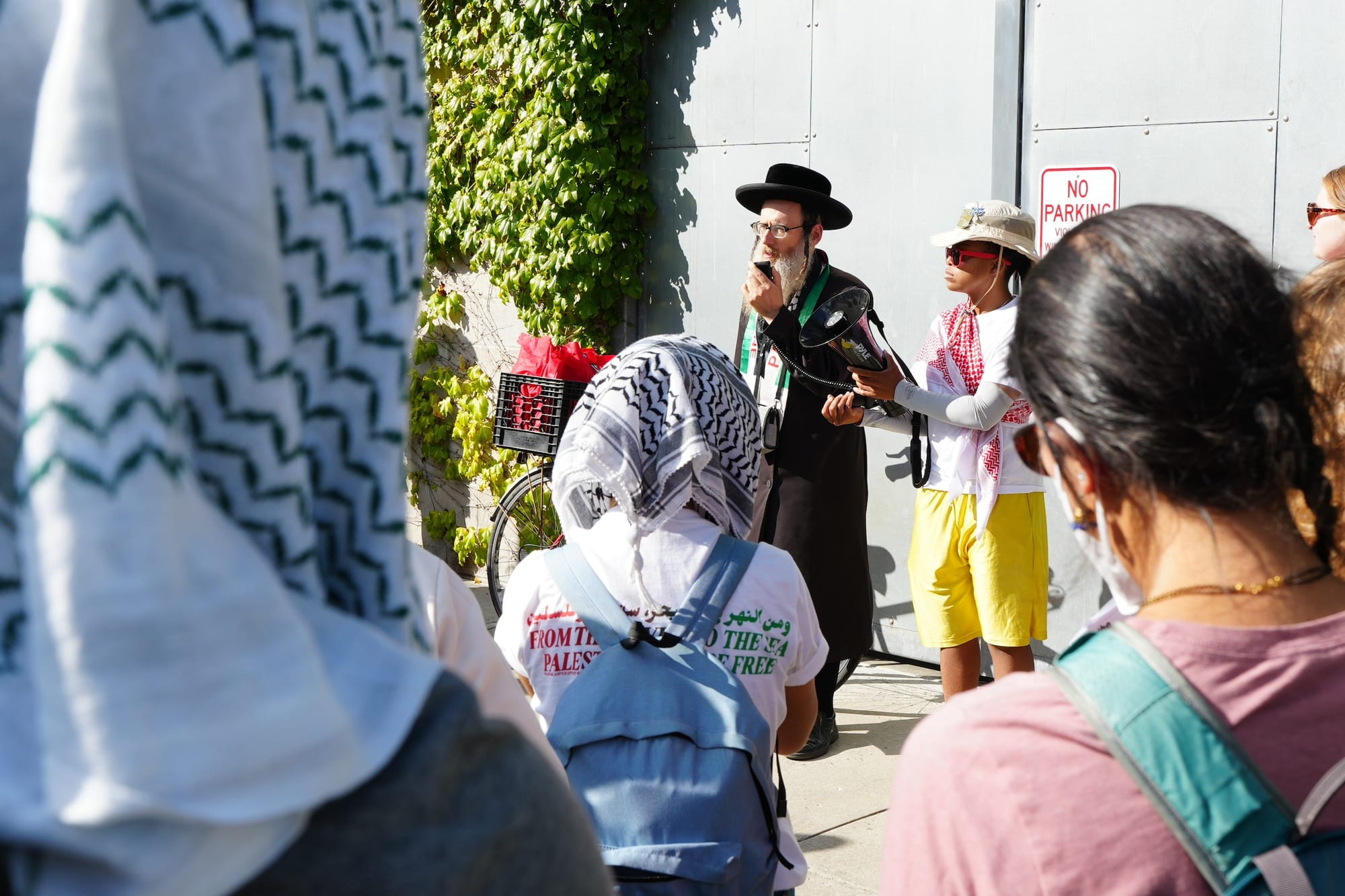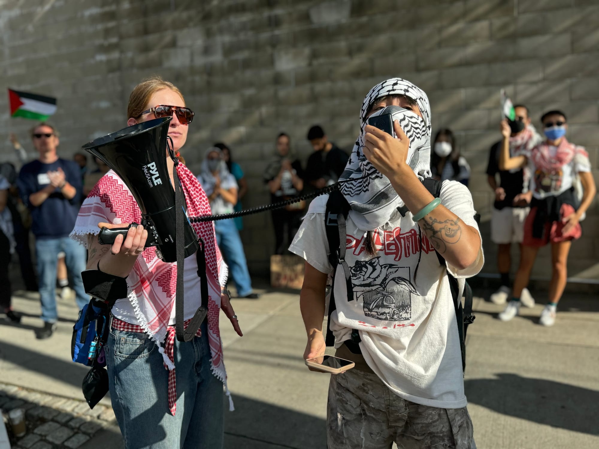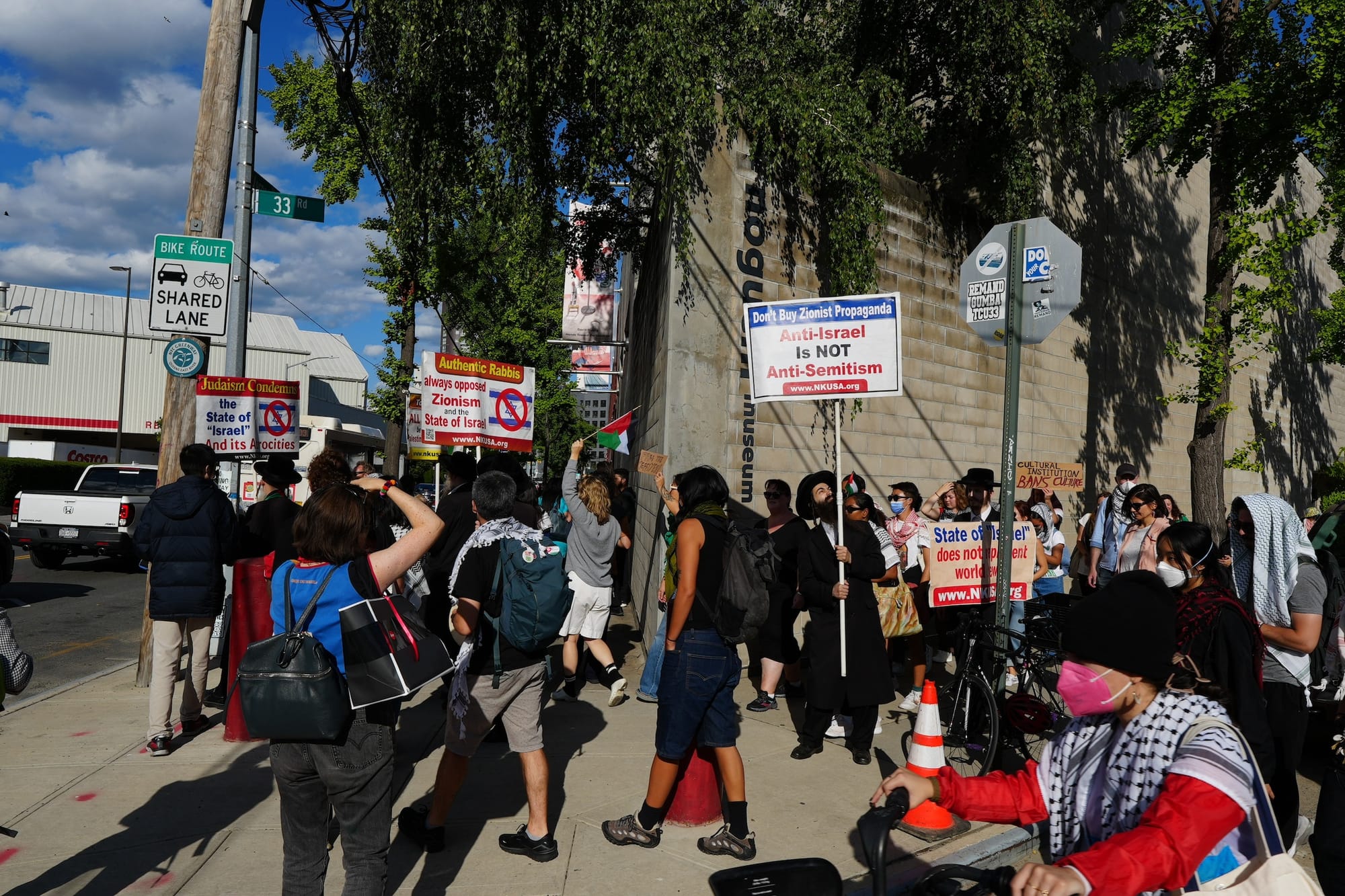 Some drivers advancing down Vernon Boulevard honked and waved in support, while others voiced criticism. While one woman stopped to take a flyer and wave her keffiyeh, another man shouted, "Worry about the people in the projects! This has been going on for 4,000 years, so worry about what’s going on here!” (Scholars have argued that the stereotype of the region as permanently war-torn is incorrect and perpetuates anti-Arab discrimination.)