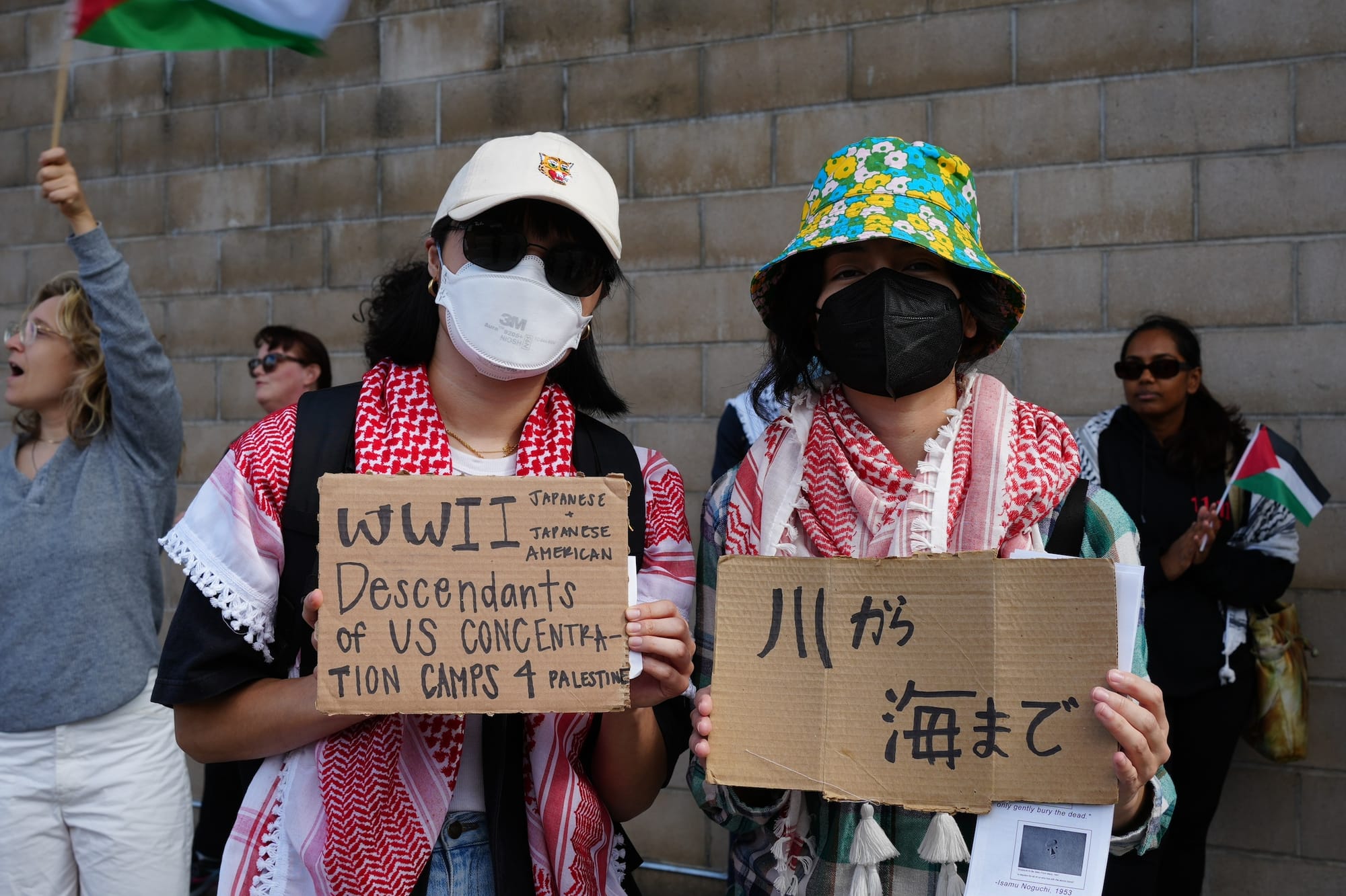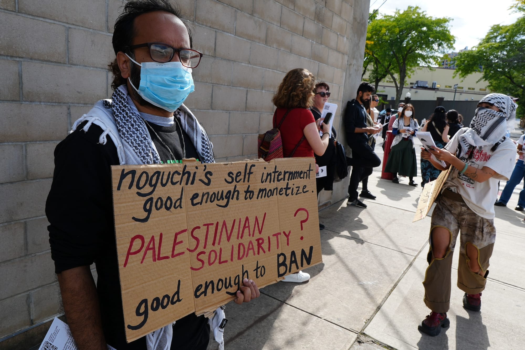 On Sunday, signs with phrases like "Free Palestine" abounded, including one with the words "from the river to the sea" in Japanese and another bearing a message that has been at the heart of workers' arguments against the new rule: "Noguchi was antifascist." Currently on view at the museum are works by Isamu Noguchi directly referencing the lethality of the atomic bomb and the artist's voluntary stay in a Japanese-American concentration camp in Arizona during World War II, speakers pointed out during the demonstration.