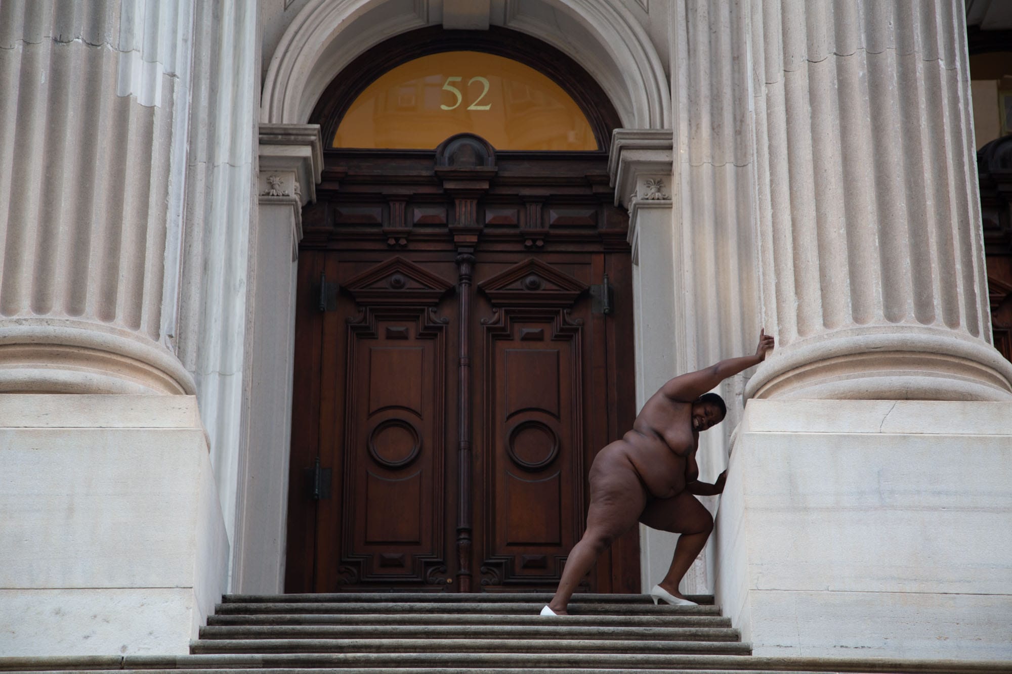 What is most shocking about this photograph is not her nudity or fleshy embodiment, but rather the frightening revelation that history lives on whether or not it is properly accounted for. The average New Yorker is likely unaware of the slave past in this cosmopolitan city, as we are taught that such trafficking in human flesh was just the business of the US South. The urban infrastructure conceals such dark pasts that are perhaps more noticeable in the expanses of Southern plantations. Faustine’s body marks the spot and transmits the essential message that has been too long erased and ignored: The wealth of the urban North, New York included, was forged from slavery. From the wombs of the enslaved birthed the humans-turned-commodities that built the ever-increasing wealth of the elite. Without the plight of enslaved Black women in New York, there is no Wall Street. The truth the photograph tells is unsettling because it persists today: Faustine’s guerilla-style self-portraiture carries specific risks as she is a plus-size Black woman whose body is vulnerable to the exploitation and hyper-sexualization that has continued since slavery.