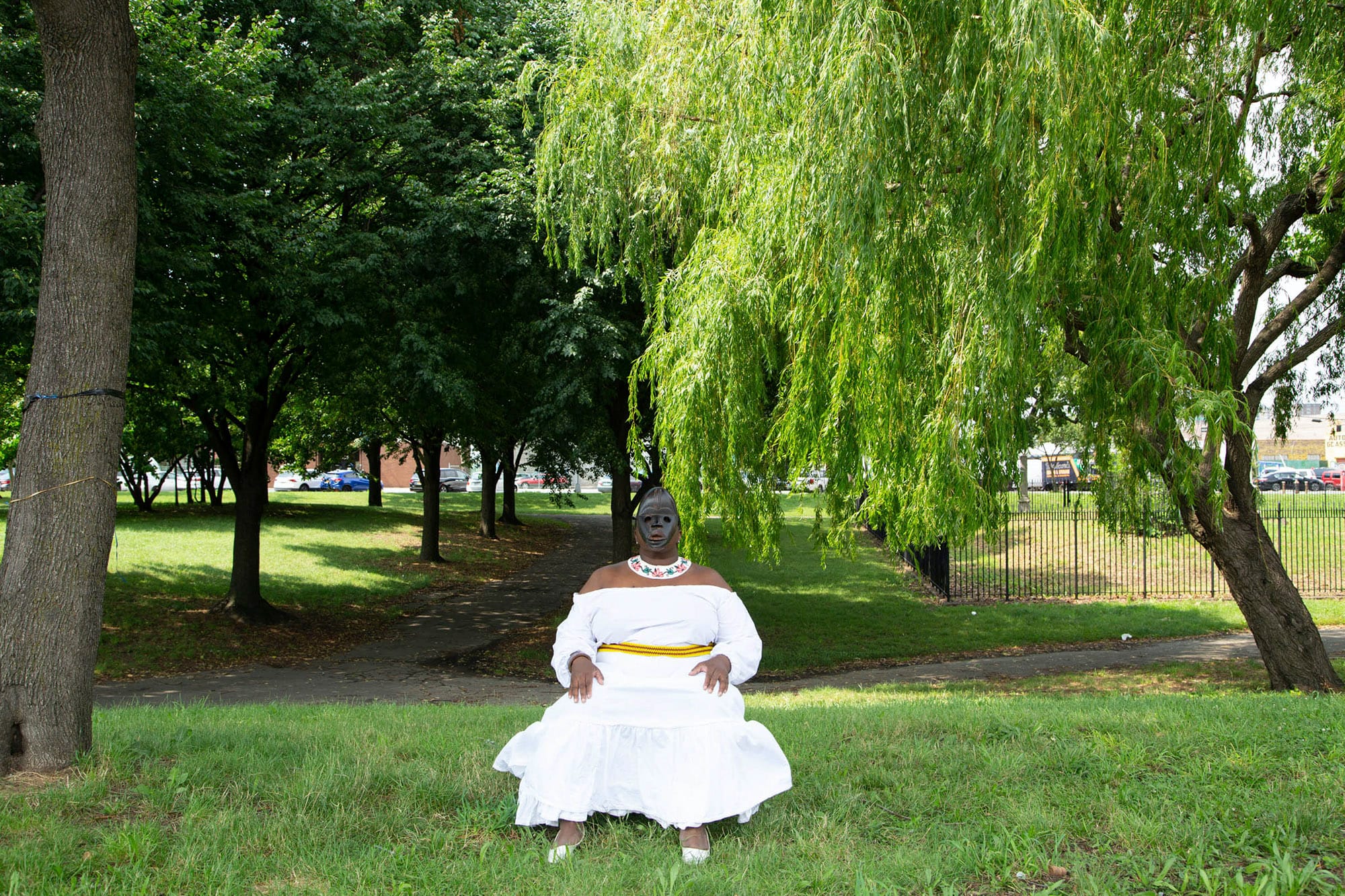 It is profound to witness the Brooklyn-related photographs and histories in the Brooklyn Museum itself. “Say Her Name” (2016), photographed in the Flatbush apartment where Faustine’s family lives, shows the artist laid out as if she’s the deceased at a funeral, her mother sitting besides her. Faustine created the work to honor Sandra Bland, who died in police custody in 2015, and it does so poignantly by attending to the grief of Bland’s mother, Geneva Reed Veal; Veal has advocated for victims and survivors of police violence since her daughter’s untimely death. Encouraging further meditation on loss, “She Gave Them Everything They Asked and Still They Asked for More, Brooklyn Botanic Garden, Brooklyn, NY” (2015) was photographed right next door to the museum. Faustine poses on the ground amid dense palm bushes, wearing a mask that evokes the art of global Black masquerade.