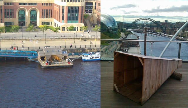 “~Flow” consists of two parts: a paddle mill constructed on a small pontoon that sits in the water on the opposite side of the River Tyne from BALTIC. Microphones in the water pick up various sounds and transmit them to an aerial situated on the fourth floor viewing platform of the museum. The aerial is attached to a wooden horn, which emits a variety of slurps, bloops and buzzes, that change according to such factors as the rate of the water’s passage over the paddle mill, the alkalinity of the water and so on. The piece combines crude technology with elegant design, and serves to unite different spaces and places — water and air, noise and silence, river and buildings, above and below — in a thought-provoking and imaginative away.
