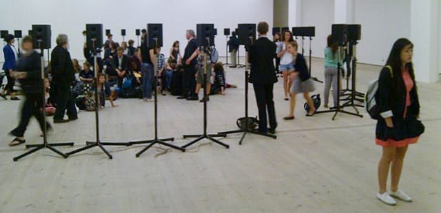 The older piece is Janet Cardiff’s “The Forty Part Motet” (2001), which was commissioned for the opening of the BALTIC and which has since been seen/heard around the world. It’s a simple concept: take a piece of vocal music by the English Renaissance compose Thomas Tallis and play it over forty speakers, arranged in a circle of eight groups of five. I won’t describe the piece in too much detail, as it’s been thoroughly documented in many other places (for instance, it was shown at PS1 in New York City in 2011). There is, however, a connection to one of the newer pieces, which also involves sound, “~Flow” (2012), by Owl Project and artist Ed Carter.