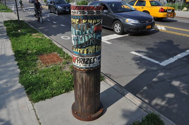 In addition to their wheatpasted works, Faile is also known for their spinning prayer wheels, carved wooden posts that resemble a combination of Buddhist prayer wheels and street posts. With the market currently obsessed with street art works, Faile’s prayer wheels are sold for high prices, tens of thousands of dollars according to Animal NY. Street art enthusiasts are so in love by Faile’s prayer wheels that at least two prayer wheels have been stolen — or something — right off of the street in Williamsburg and on the Bowery, where they were both bolted to the street.