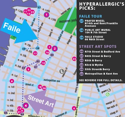 The Northside Arts Festival guide with Hyperallergic’s Faile Tour and Street Art Spots can be found at Reverse Space at 28 Frost Street and various locations around North Brooklyn.