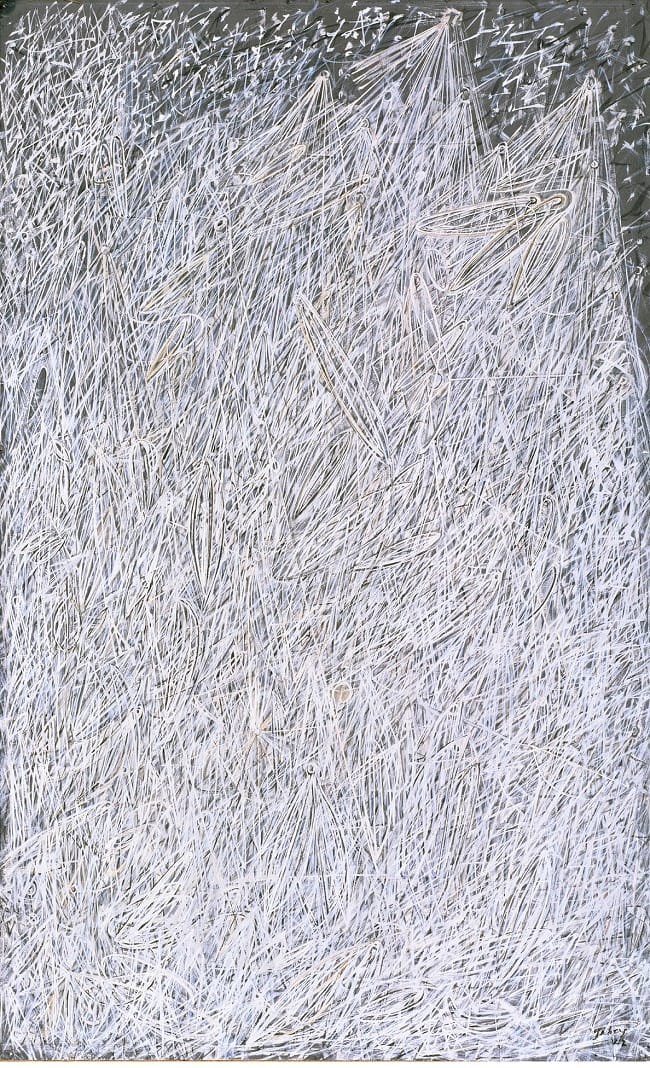 Eventually, two decades after the thrill of Armistice Day, Tobey began to create pictures crowded with figures — not always figures, exactly, but often a shorthand suggestion of figures, people enmeshed in a web of white lines that seemed to demarcate the massive force field emanating from human minds and hearts, an aggregate energy so palpable and so powerful it could almost glow in the dark.