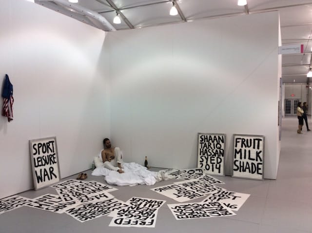 At the opening night of the Untitled fair on the beach, there was an impromptu performance by Shaan Syed at Ana Cristea Gallery occasioned by a customs embargo on his paintings, which the gallery had intended to display. Syed imitated the famous Bed-Ins for Peace, in which Yoko Ono and John Lennon dressed in white and stayed in bed to protest the Vietnam War. Syed stationed himself in the corner of the gallery’s booth, bare-chested and in loose white trousers, surrounded by sheets of paper on which he had painted various words. The public seemed to revel in the work, as they crossed the line and joined him in bed or posed for selfies with the artist. Perhaps because of its unplanned quality, it had a lovely freshness to it. Nothing was for sale yet, though, to her credit, his dealer was quick to offer up pictures of the embargoed work.