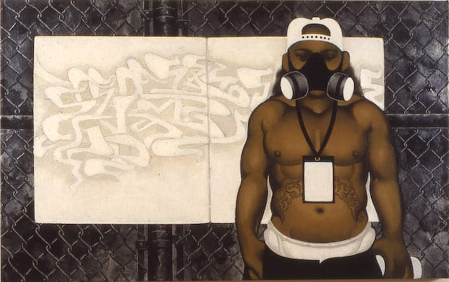 Martin Wong and Sharp, “Sharp Paints a Picture” (1997-98), acrylic on canvas , 30 x 48 inches (courtesy the Estate of Martin Wong and P.P.O.W Gallery, New York)