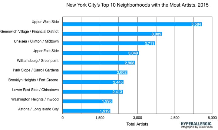 But Manhattan, that year, was still home to the neighborhood with the most artists: the Upper West Side, which witnessed a 2.5% increase to 5,584. The report notes that one of the biggest upswings occurred in Central Harlem, where the number of artists went up 216%, to 956.