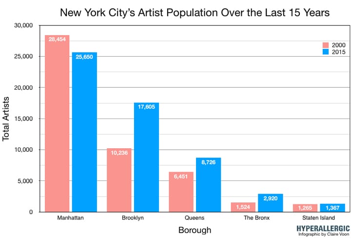 While the artist population in Manhattan is in decline, the number of artists in the Bronx nearly doubled since 2000.