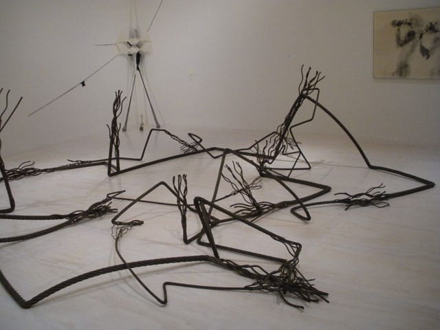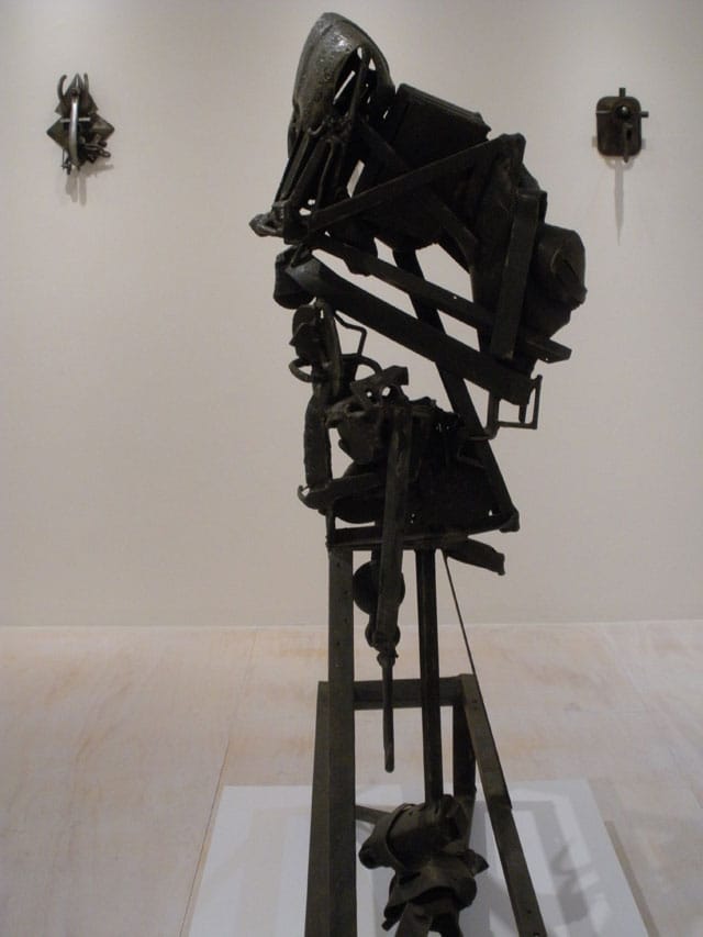 The show opens with a gallery of work by some of the precedent setters, among them social realist drawings by figurehead Charles White and deeply evocative steel sculptures by Melvin Edwards, the pair of which immediately demonstrates the different ways that art can be political. From there, a stunning room full of assemblages by Betye Saar and John Outterbridge mixes motifs, mediums, and high and low art, the artists drawing on voodoo, traditional African patterns, junk art, Rauschenberg’s confines, and much more. The pieces seem to be carrying on a charged conversation of their own — one that bleeds over into the next room, where more assemblages by Dale Brockman Davis and Noah Purifoy pick up on Saar’s and Outterbridge’s visual themes and inspirations. The gritty but often colorful aesthetic of those works resonates with John T. Riddle’s biting (in subject matter) yet playful (in appearance) metal sculptures, also on view in that gallery.