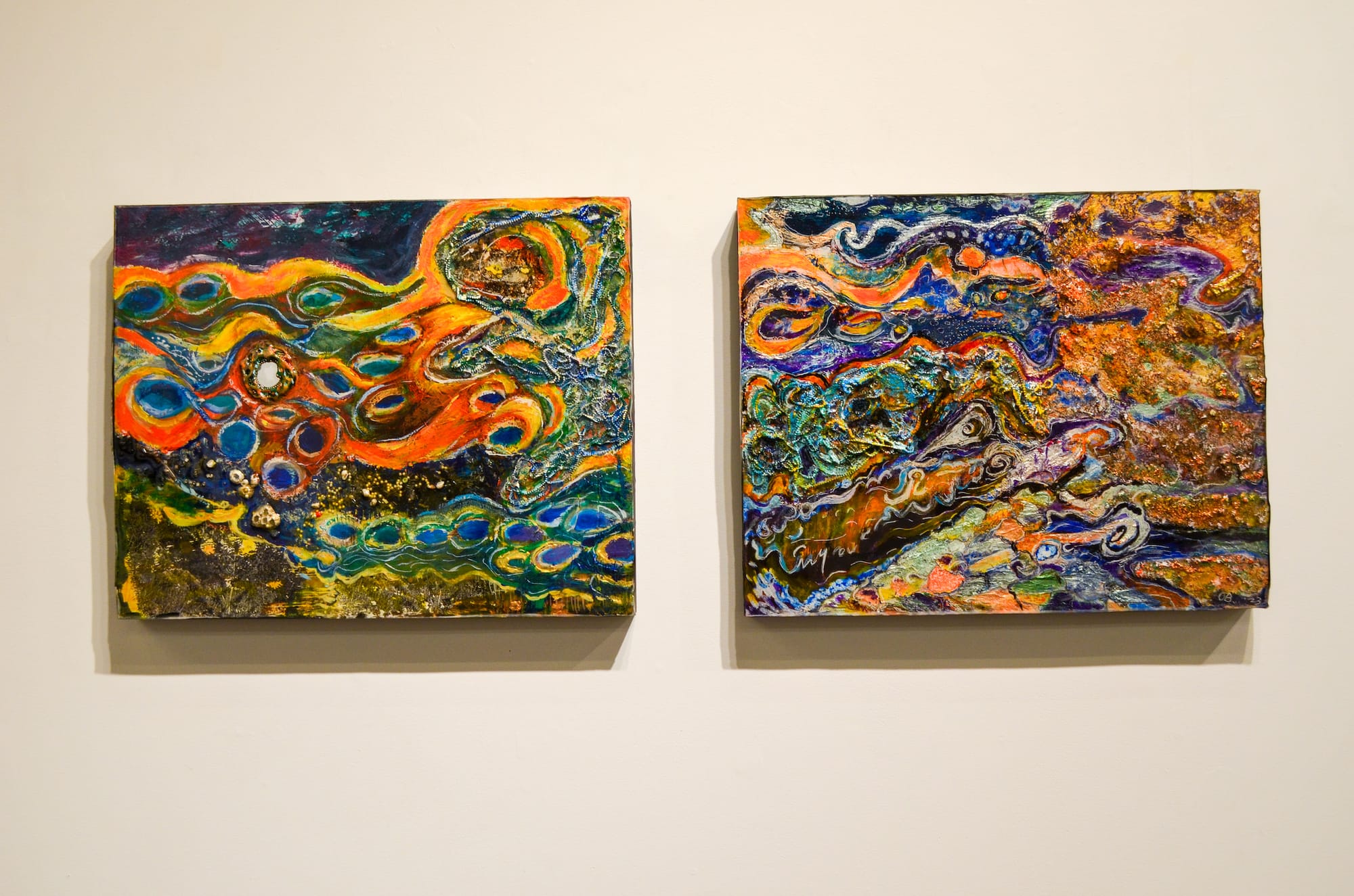 This is Beens’s first time showing in an art fair, where she chose to present a body of work that departs from her usual “sacred” and “profane” sculpture. Instead, she’s embracing her entrance into the 2D world with bright colors, celestial scenes, and resin.