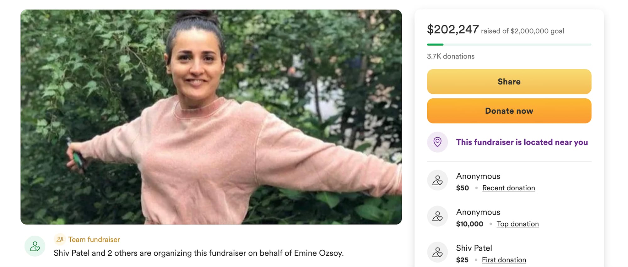 Ozsoy's friends started a GoFundMe to cover her growing medical expenses, raising nearly $200,000 so far. Emine's husband Ferdi Oszoy — her only family in the United States — said in a statement that he is trying to secure emergency visas for her relatives to visit.
