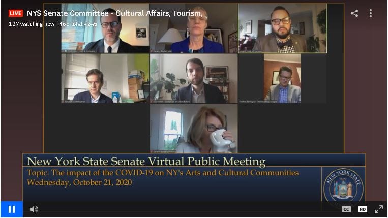 In a virtual roundtable this earlier week, New York lawmakers heard bleak reports and urgent pleas for funding from leaders of arts organizations across the state. The online meeting, held by the NY Senate Standing Committee on Cultural Affairs, Tourism, Parks and Recreation on Wednesday, October 21, discussed the devastating effects of the COVID-19 pandemic on the arts with testimonies by more than a dozen experts from the cultural sector.