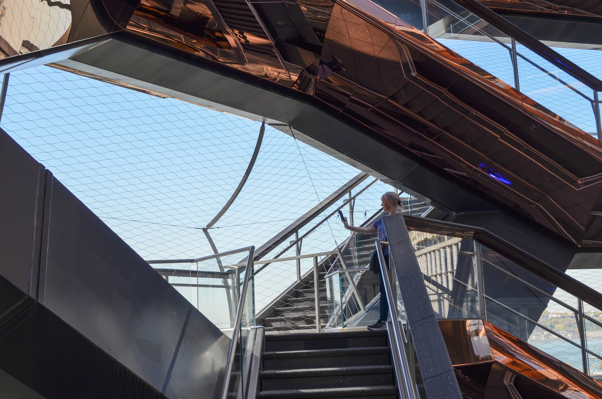 On Tuesday, October 22, a day after the attraction reopened, tourists returned in swarms to climb and photograph the Vessel. After the security checkpoint, visitors had mostly free range inside. The netting covers only the front-facing pods beginning on the third floor, and no security guards were posted above ground level.