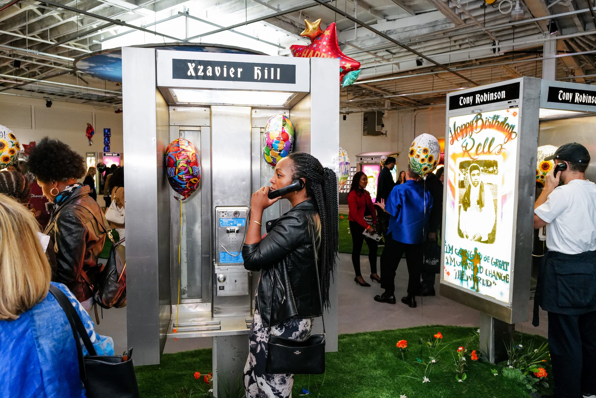 In the center of the current exhibition, on view through January 16, 2023, twelve upcycled NYC payphones — one per “celebrant” — are arranged in a semi-circle facing a huge mural by local airbrush artist Kenya “Art1 Airbrush” Lawton. The wall depicts all 12 celebrants, plus Michael Brown, the Ferguson, Missouri teen whose 2014 killing helped galvanize the first national Black Lives Matter movement, beneath the words Happy Heavenly Birthday. Gorjestani told Hyperallergic that the payphones, which ring periodically with voicemail messages from family members, friends, and strangers, serve “as monuments, beacons of love.” Each booth, designed by New York artist and designer Paige Hanserd in collaboration with the families, is decorated with flowers, Mylar birthday balloons, bodega candles, and snapshots of celebrants.