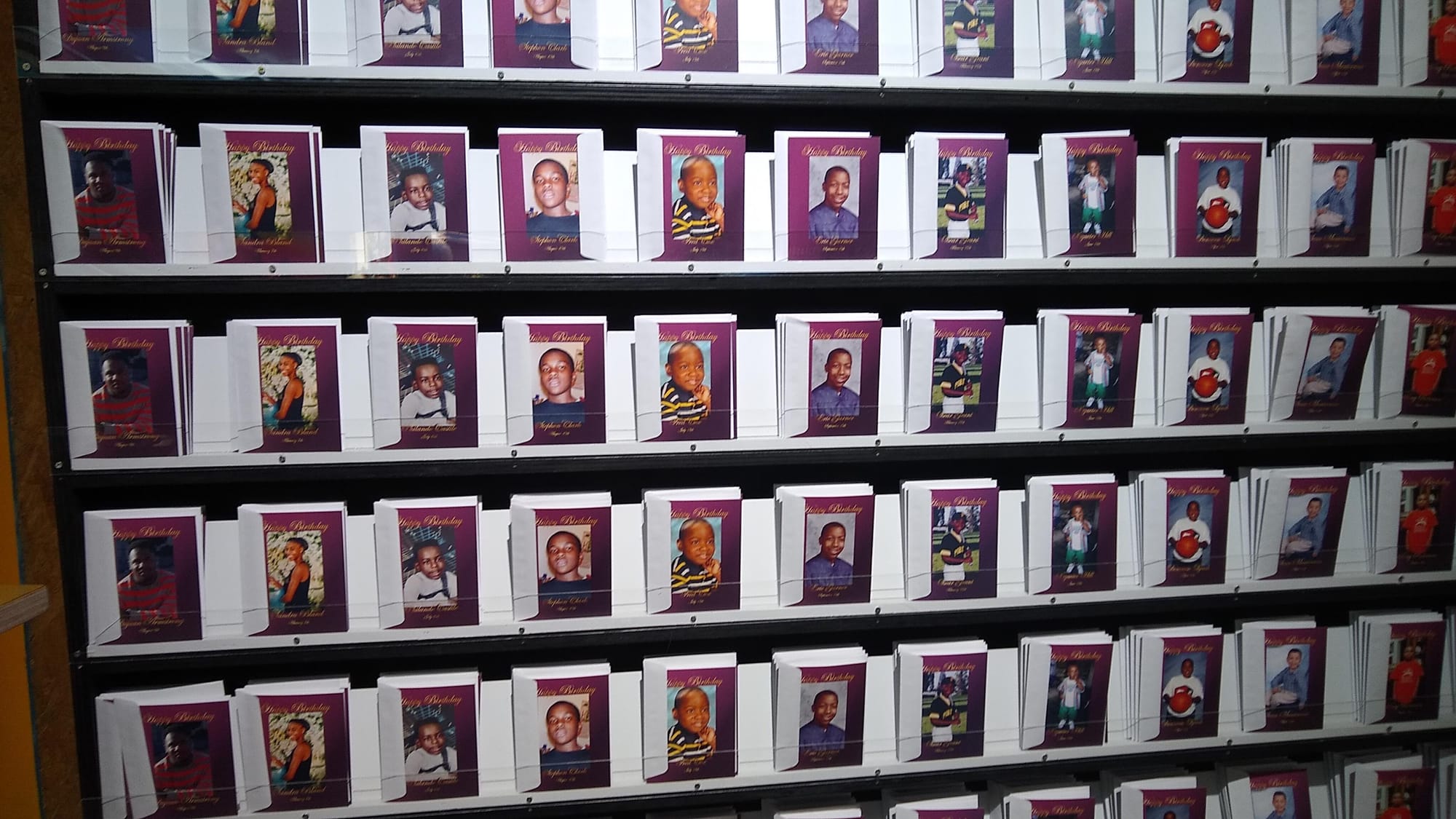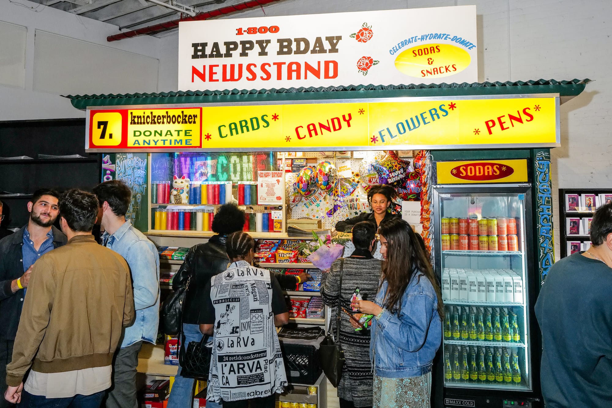 WORTHLESSSTUDIOS curator Klaudia Ofwona Draber walked Hyperallergic through the interactive space, pointing out that all the dates in the exhibition are birthdays — “There are no deathdates.” A screening room plays Gorjestani’s film series about birthday celebrations for Grant, Castile, and Woods. In the flower shop, visitors can buy blossoms to place at the mural or in phone booths; in the bodega and newsstand, they can purchase drinks, candy, balloons, and birthday cards featuring portraits of the celebrants, which can then be “mailed” in the mail slot on the stoop. At the end of the show, proceeds from all sales will be split among the survivors.