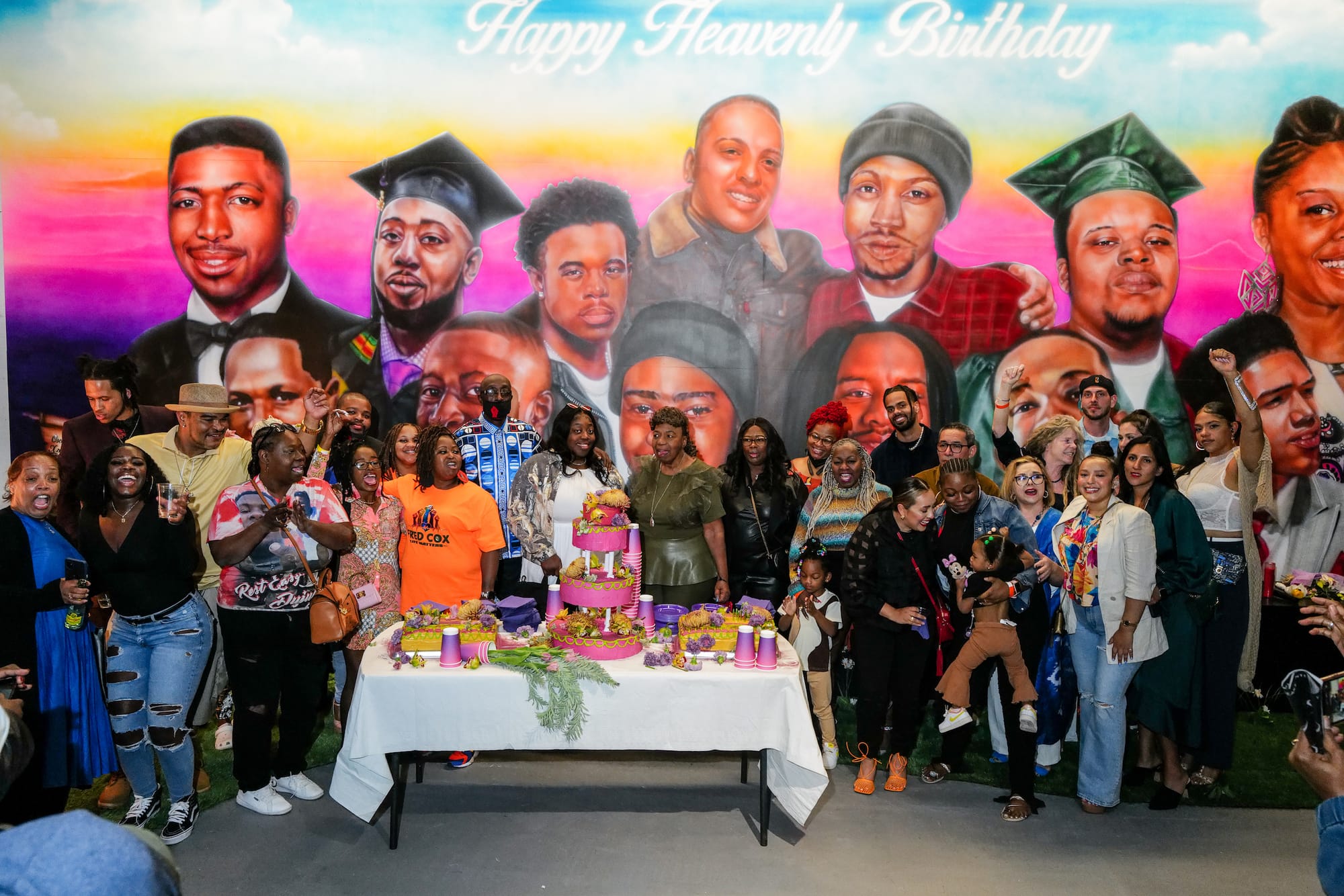 In a designated Opportunity Zone in Brooklyn at the intersection of industry and artist housing, the families of Dujuan Armstrong, Sandra Bland, Philando Castile, Stephon Clark, Fred Cox, Eric Garner, Oscar Grant, Xzavier Hill, Donovon Lynch, Sean Monterrosa, Tony “Terrell” Robinson Jr., and Mario Woods recently gathered to celebrate the birthdays of their loved ones slain by police. Over colorful birthday cakes and platters of food, they passed photo albums and shared stories. What distinguished this get-together was that the entire neighborhood — bodega, newsstand, flower shop, Brownstone stoop, park bench with graffiti, community mural in vibrant sunrise colors matching the cakes, even the patch of blue sky — is an art exhibition designed inside a 10,000-square-foot warehouse.