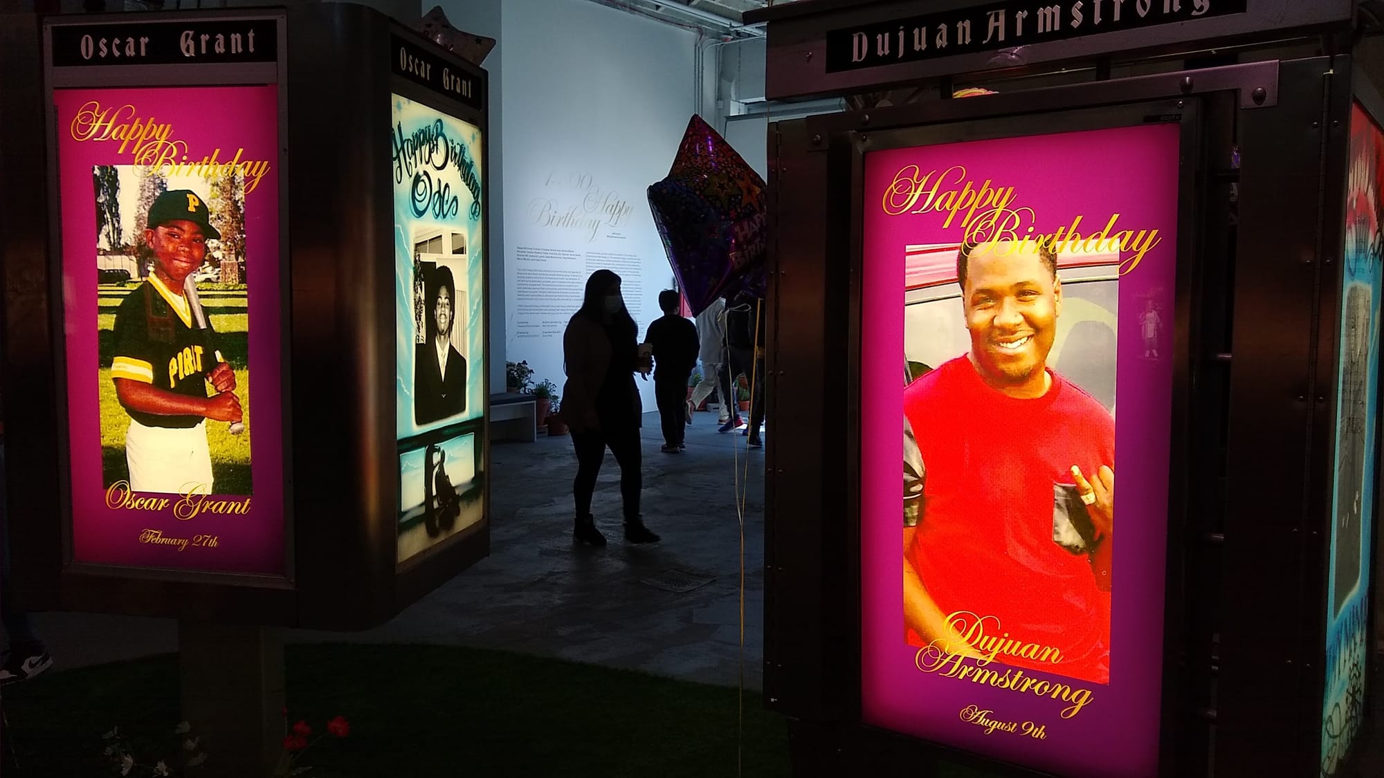 1-800 Happy Birthday, the inaugural show in the new space that arts nonprofit WORTHLESSSTUDIOS inhabits on the border of Bushwick and East Williamsburg, was created by California-based artist and filmmaker Mohammad Gorjestani with his production studio, Even/Odd, and curated by Klaudia Ofwona Draber, with artistic direction by Neil Hamamoto. The idea was birthed in 2013, when Iranian-born Gorjestani started filming the annual posthumous birthday parties Rev. Wanda Johnson throws for son Oscar Grant, shot by Bay Area transit police in 2009. Frustrated by the media’s sensationalism of Black and Brown suffering, Gorjestani noted that families didn’t have space to grieve. As Sequette Clark, whose son Stephon was shot in 2018 by Sacramento police, told Hyperallergic, “The press resurrected my son only to re-assassinate him, criminalize him, vilify him.”