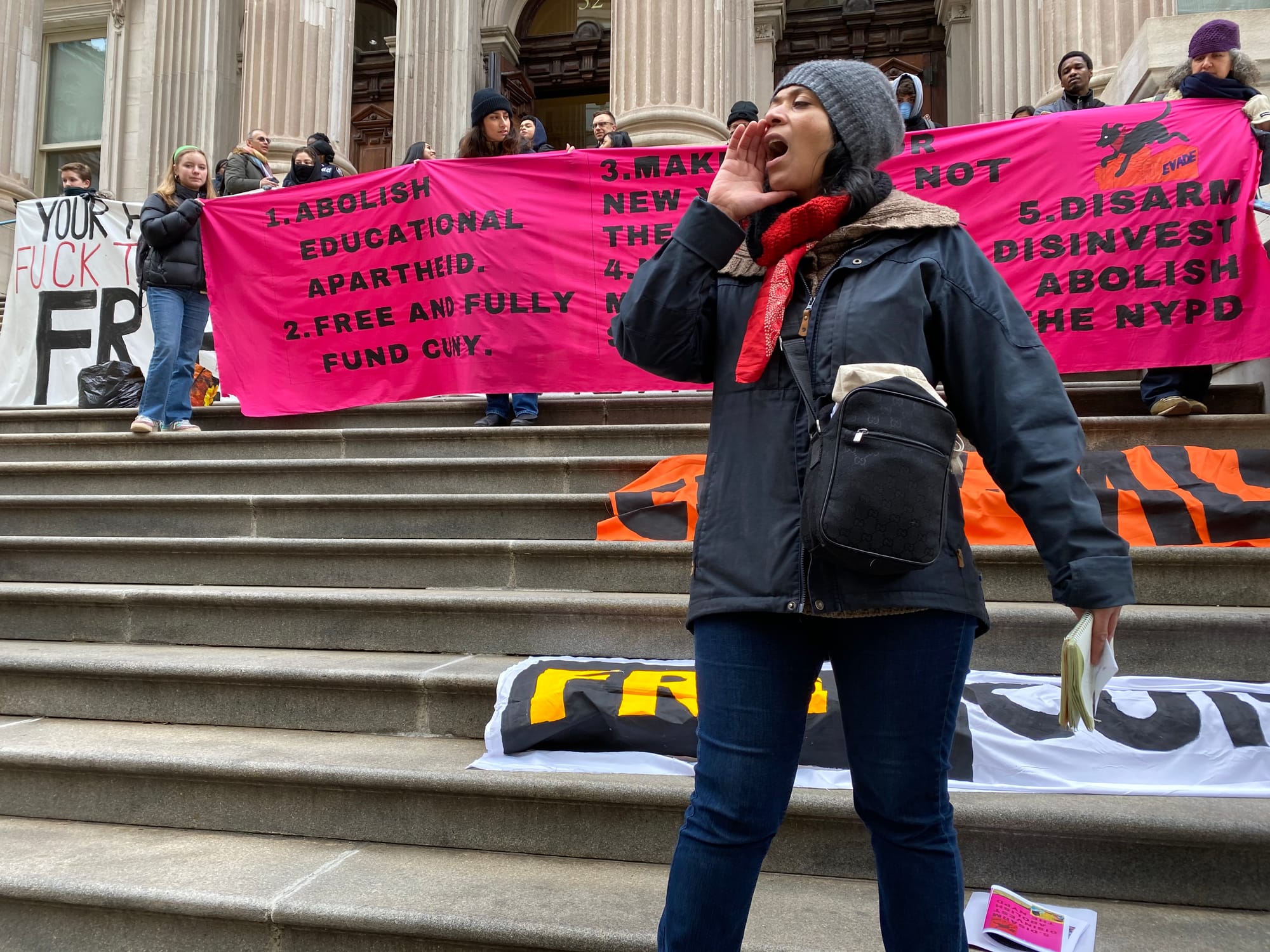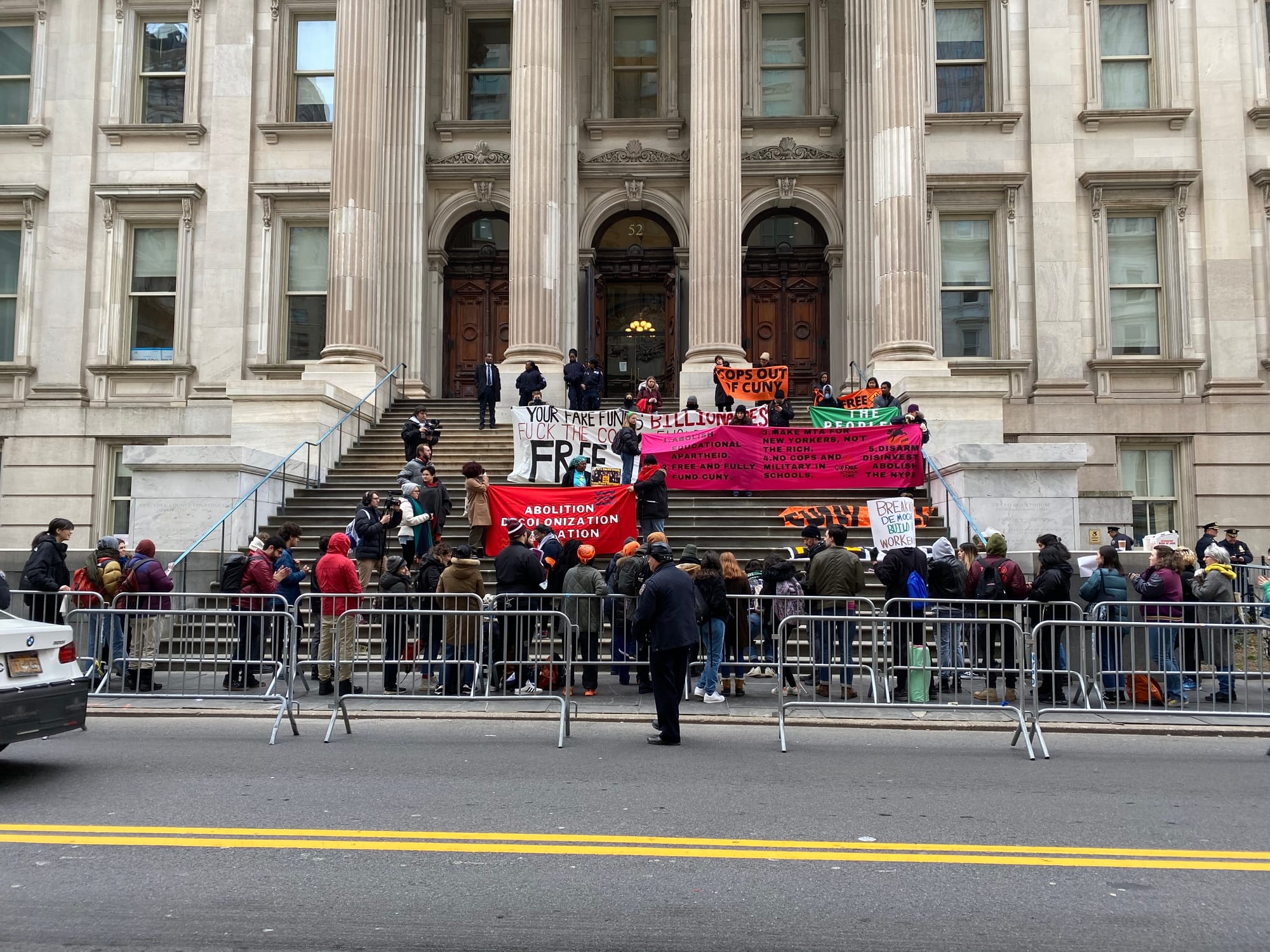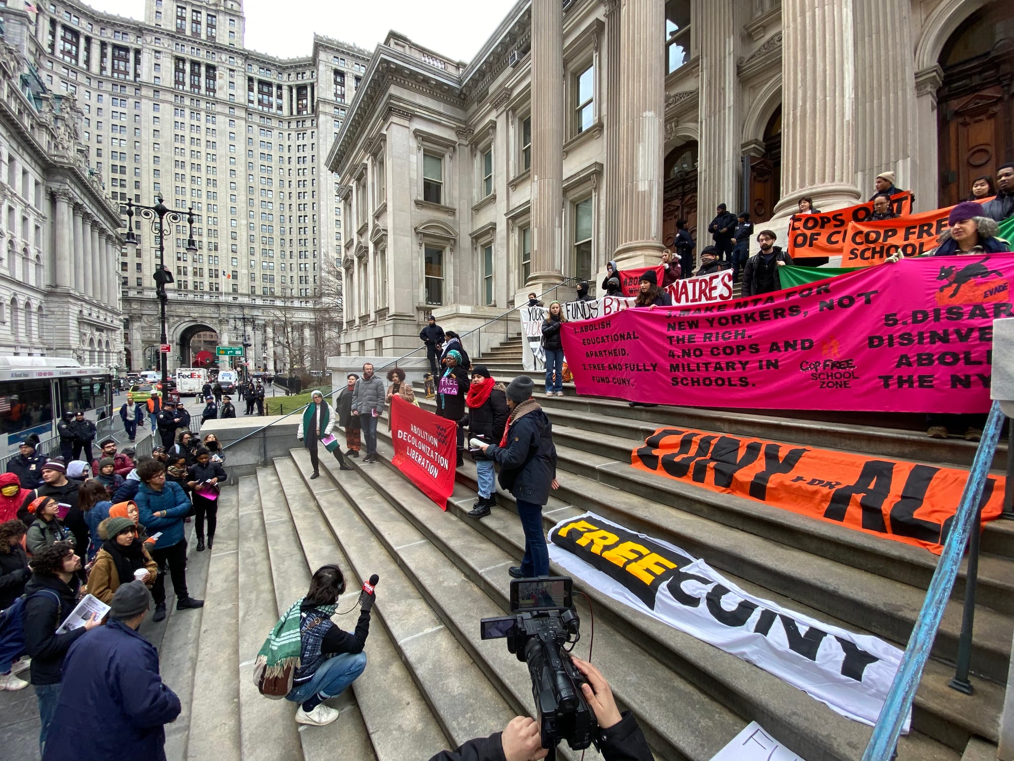 The protesters held signs that read “COPS OUT!”, “FREE CUNY”, and “FREE MTA”, among others.