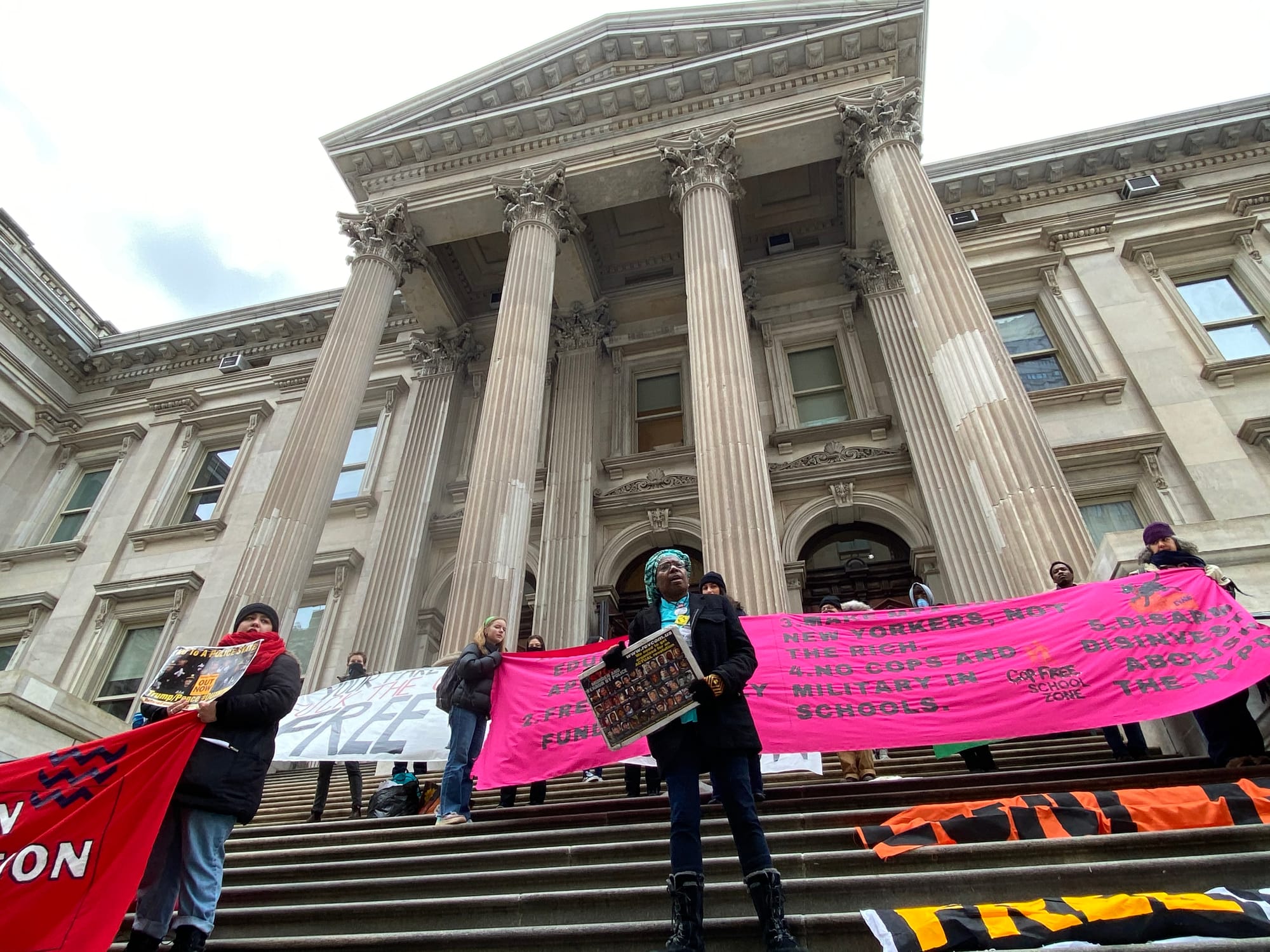 A group of about 70 high school and college students, teachers, parents, and activists gathered Friday morning, January 31, at the steps of the New York City Department of Education (DOE) building in Lower Manhattan to protest police presence in schools and subway stations, and to demand tuition-free education at City University of New York (CUNY) colleges.