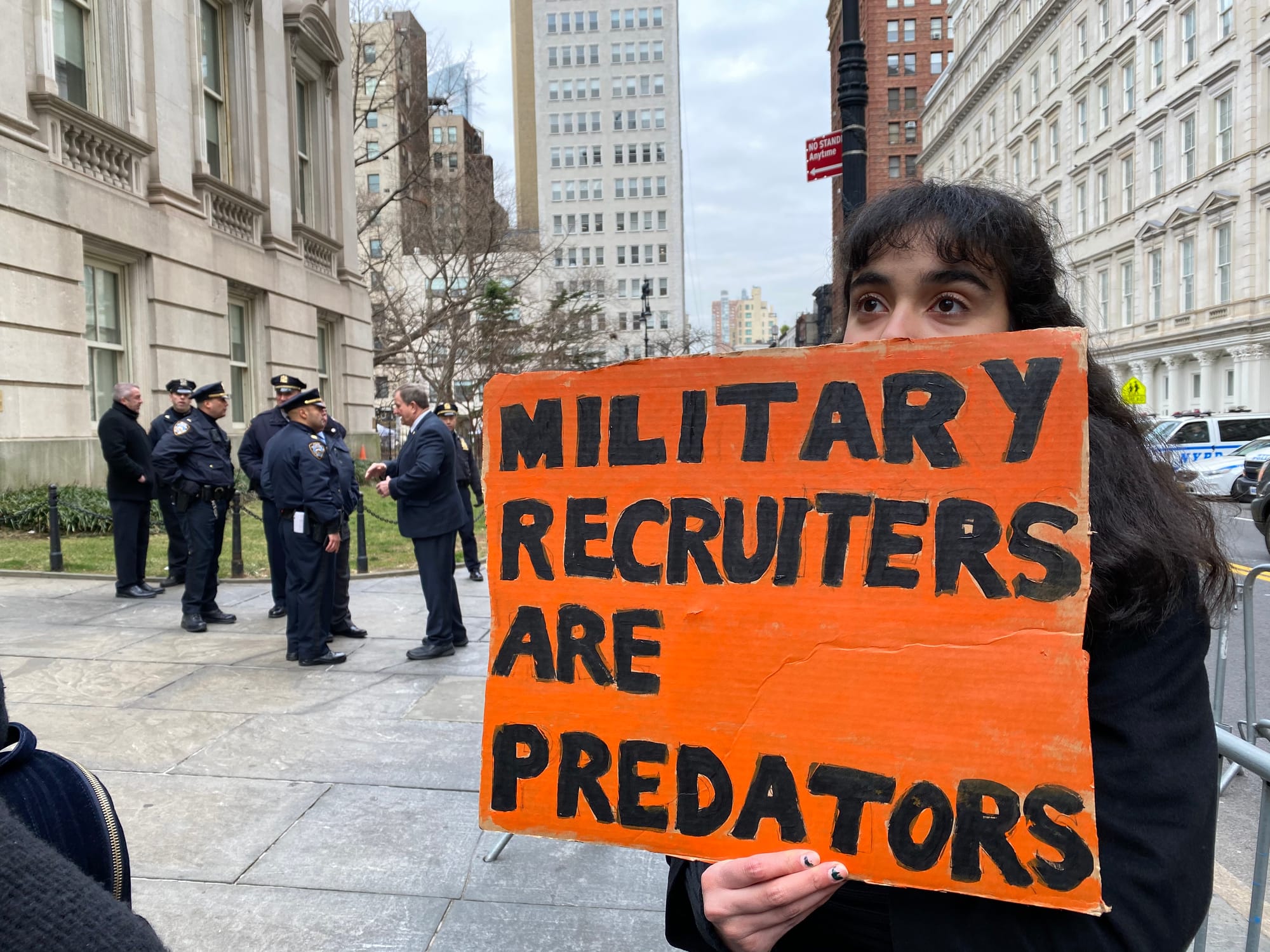 Emma Gerard, a non-matriculated student at Hunter College, says she showed up at the protest to denounce the presence of military recruiters on campus. “I’m sick of them commodifying Black and brown bodies, making students think that their only way to make an income and have a chance at education is to go into the military,” she told Hyperallergic.