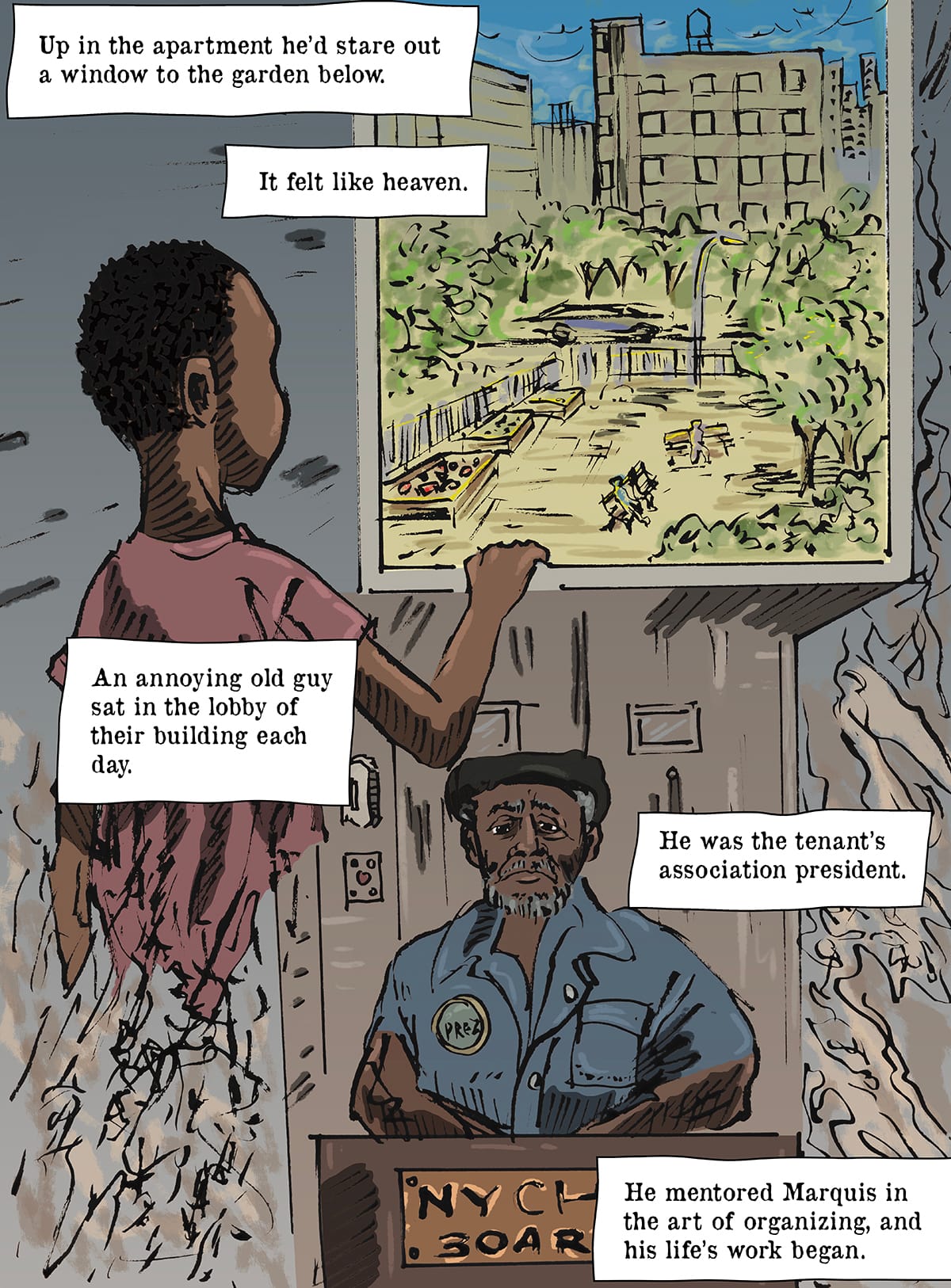 This is the fourth of a series of comics depicting transformative moments in the lives of artists, activists, and organizers on the front lines of the housing affordability crisis in New York City