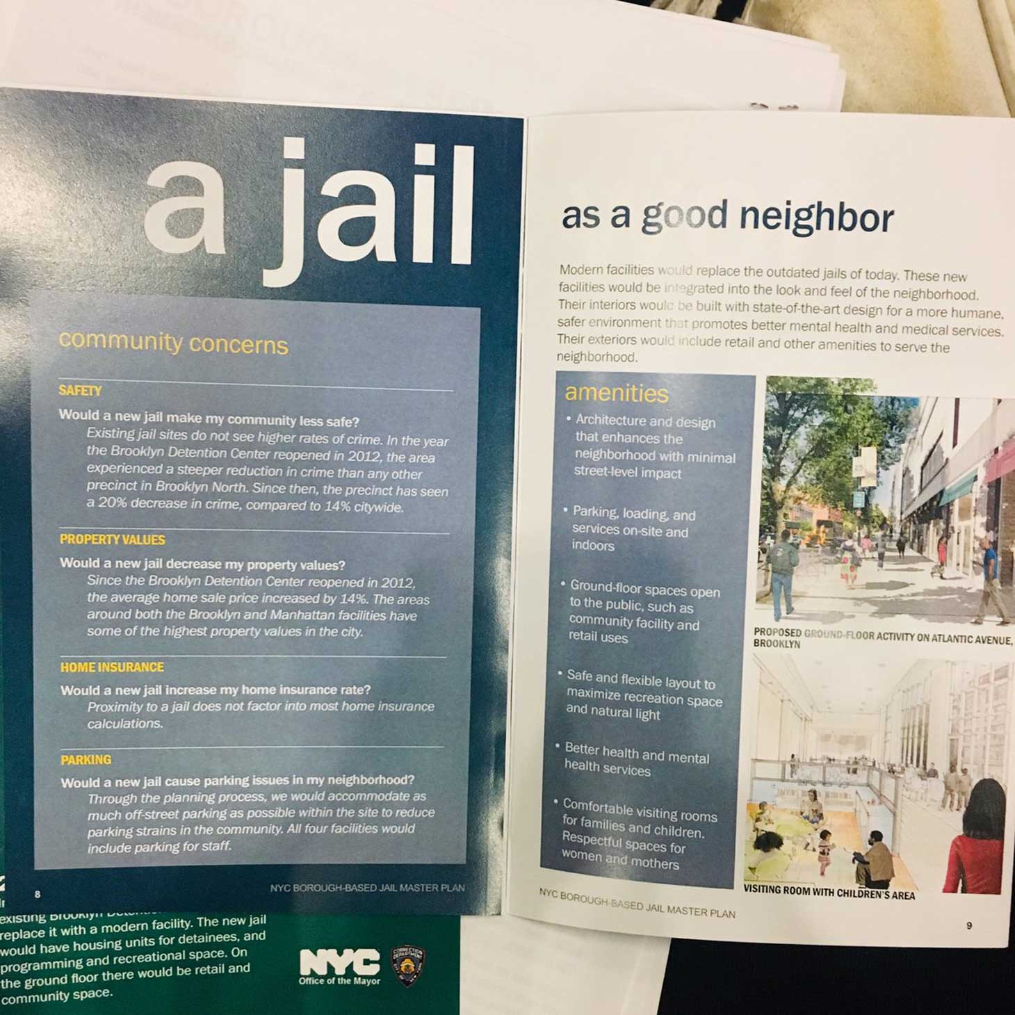 “Modern facilities would replace the outdated jails of today. These new facilities would be integrated into the look and feel of the neighborhood. Their interiors would be built with state-of-the-art design for a more humane, safer environment that promotes better mental health and medical services. Their exteriors would include retail and other amenities to serve the neighborhood,” the pamphlet states. The headline reads, “A jail as a good neighbor.” The administration argues the closer proximity to community and family members will bolster success rates following release. You can read the pamphlet in its entirety here.