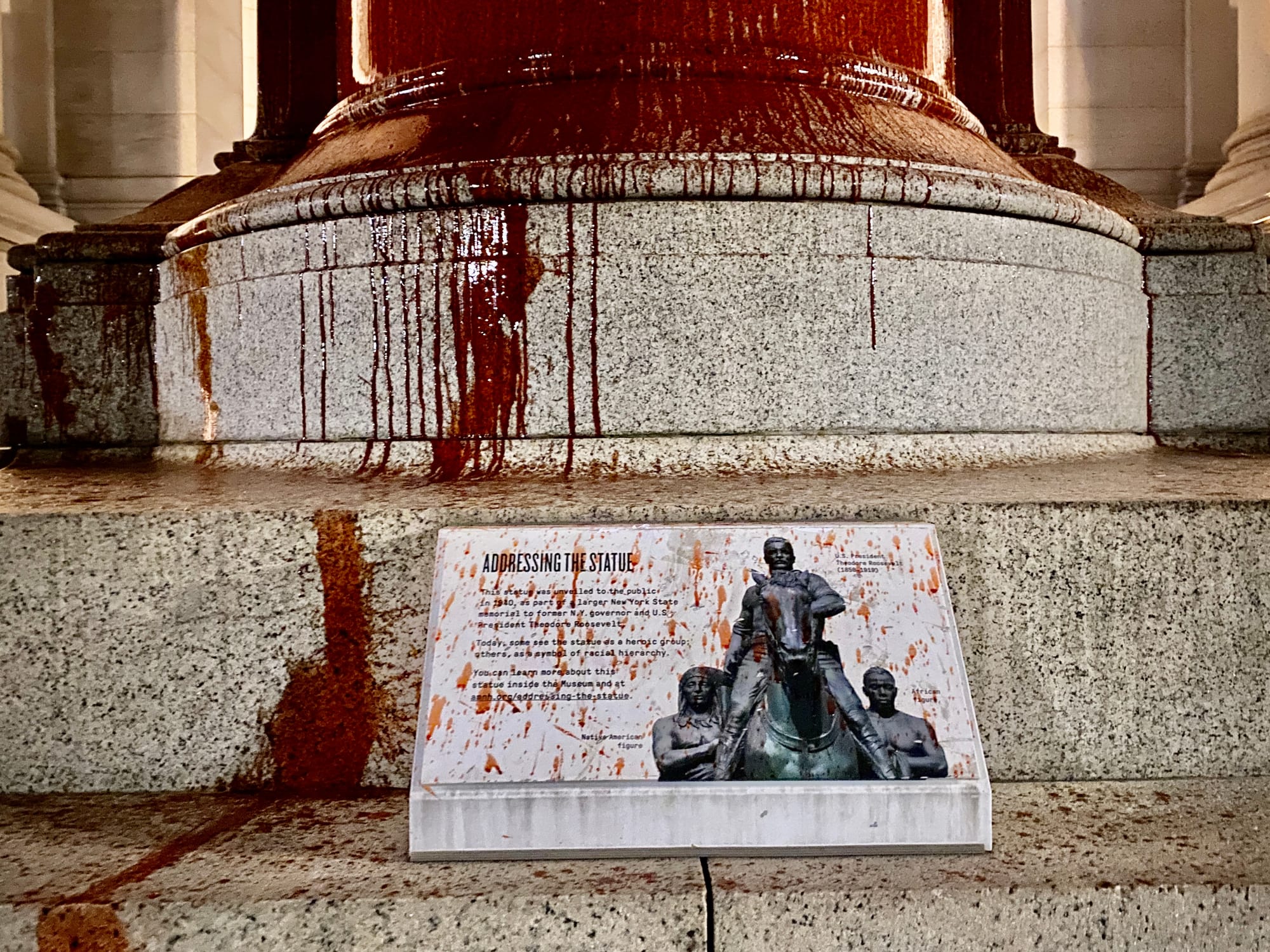 Demands to remove the Roosevelt date back to the early 1970s. Since then, the statue's plinth was defaced with red paint three times: First in 1971 by Native American protesters; then again in 2017 by members of the group Monument Removal Brigade (MRB); and most recently by anonymous protesters in October of 2021.