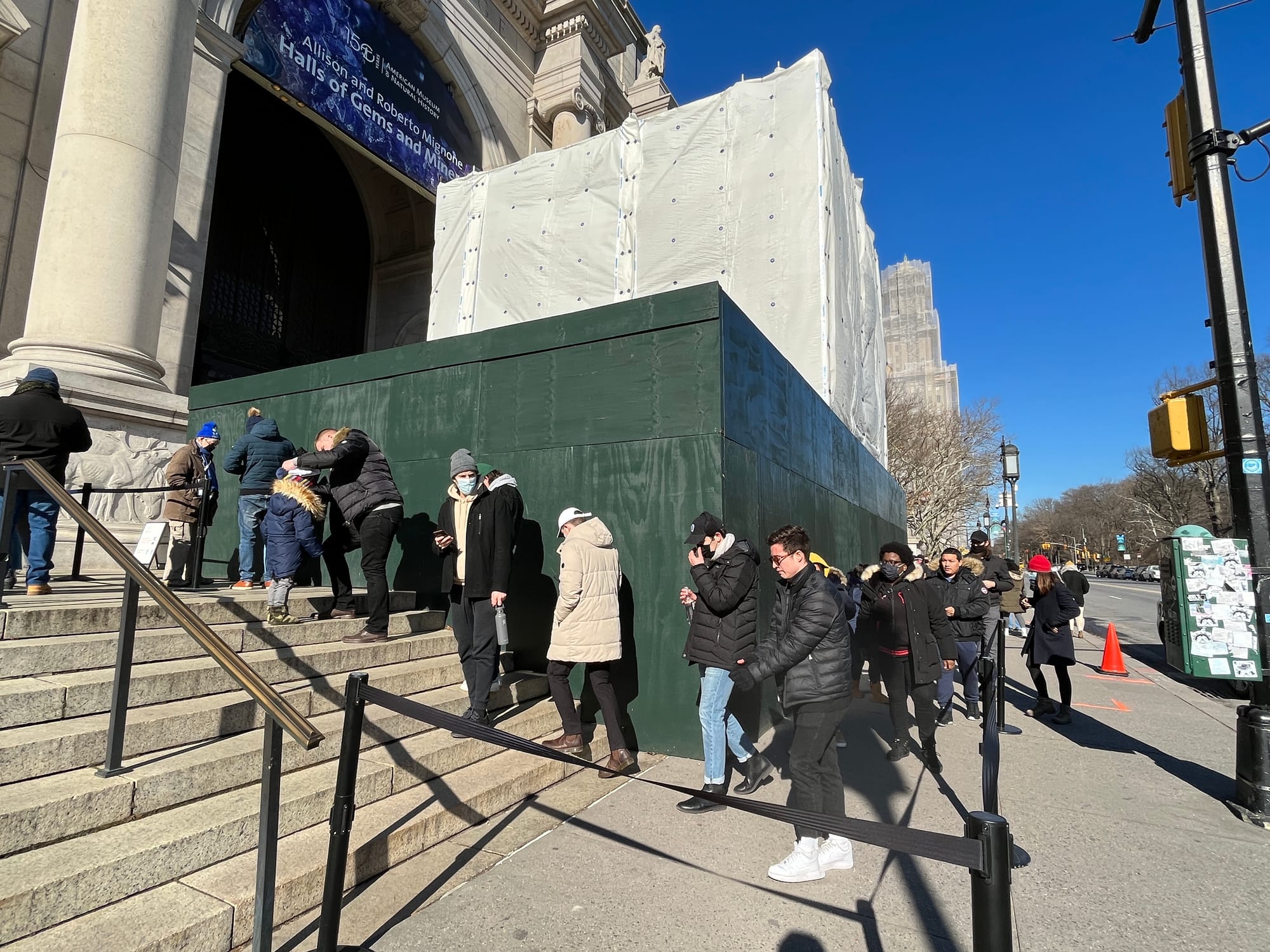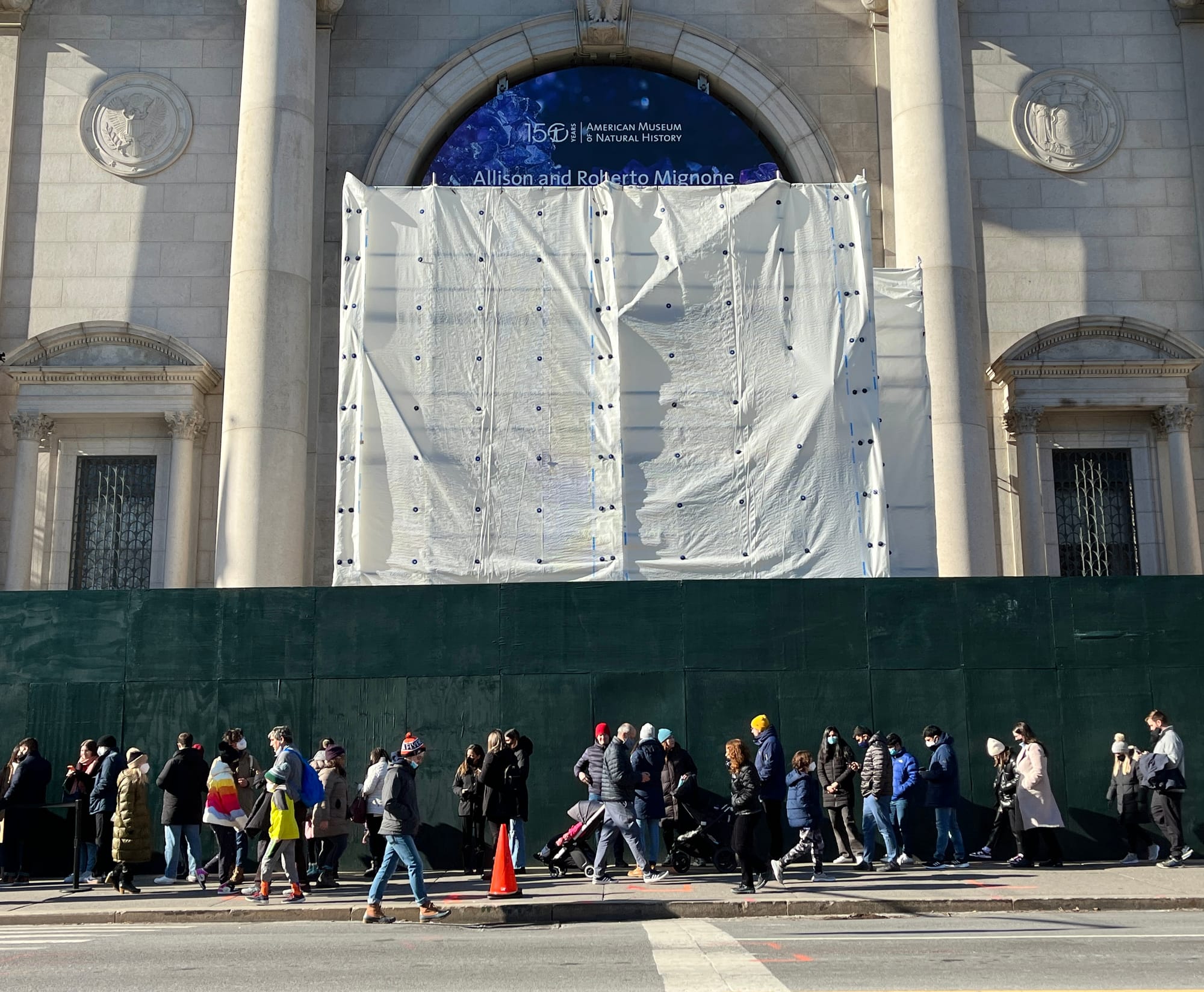 Around noon of Saturday, January 22, a long line of AMNH visitors stretched around the scaffolding and down Central Park West as they waited to pass through a COVID-19 vaccination checkpoint set up on the museum's front steps.