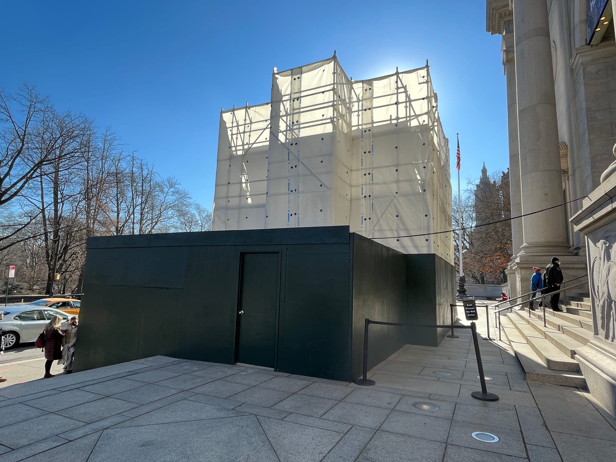 A man who identified himself as John Dewey was snapping iPhone pictures of the tarped scaffolding when he spoke with Hyperallergic. A resident of the Manhattan's Upper West Side, the businessman and "aspiring writer" said he grew up admiring the statue as a child.