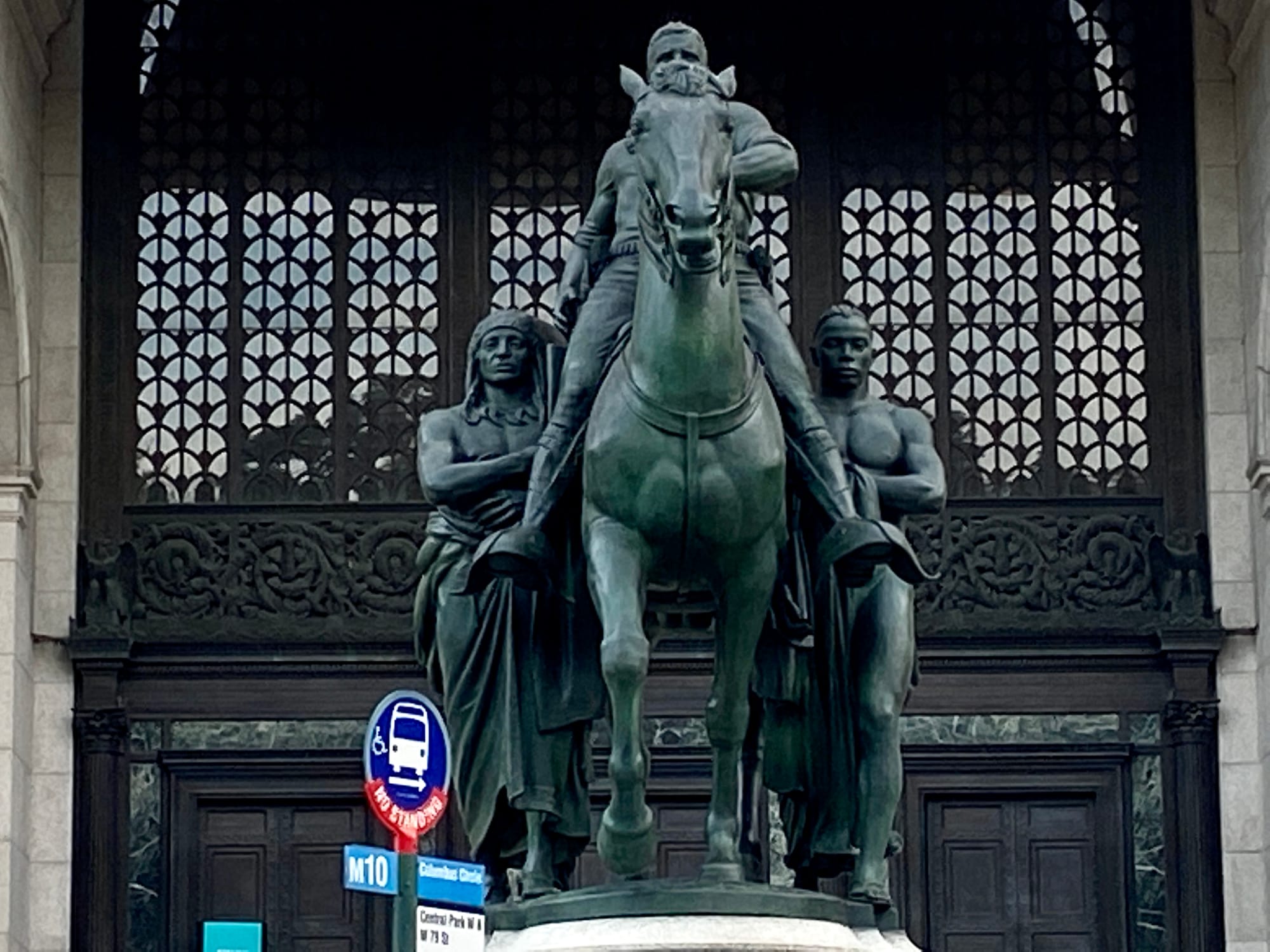 Unveiled in 1940, James Earle Fraser's bronze depicted Roosevelt in a heroic pose on horseback flanked by two shirtless, unnamed gun carriers: an Indigenous man to his right, and a Black man to his left. According to the museum's website, the statue was meant to “celebrate Theodore Roosevelt (1858–1919) as a devoted naturalist and author of works on natural history.” The former president’s father was one of the museum’s founders, the institution adds, and says it is “proud of its historic association with the Roosevelt family.”