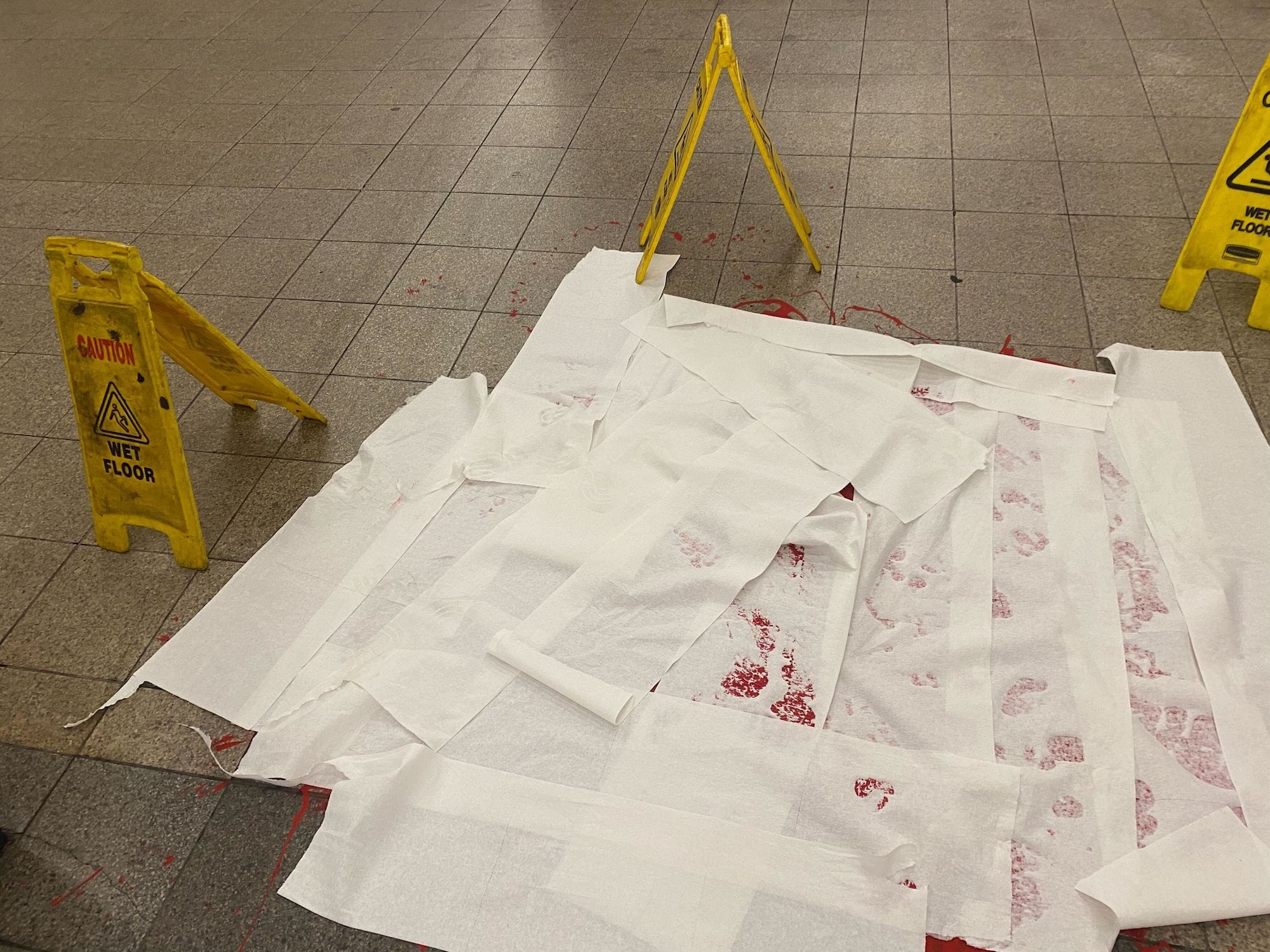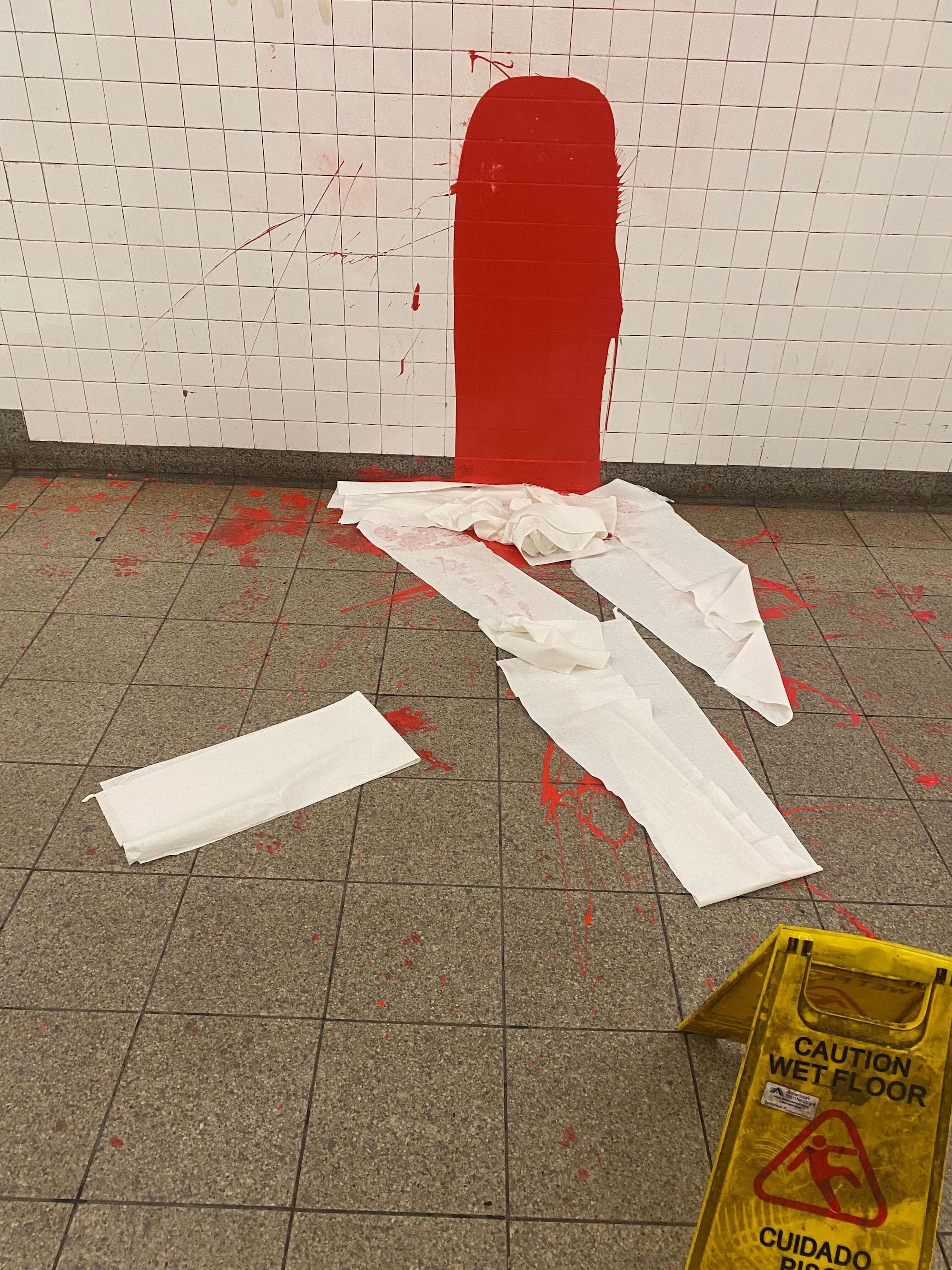 Since Neely's killing, the station located at the intersection of NoHo and SoHo has become a center for actions protesting the city’s racist criminalization of its unhoused residents and memorializing Neely. The crimson display, reminiscent of a brutal crime scene, was accompanied by a letter to “cop mayor” Eric Adams that called out “vigilante violence” and the structural imbalances of power and wealth in the city’s political and social landscape.