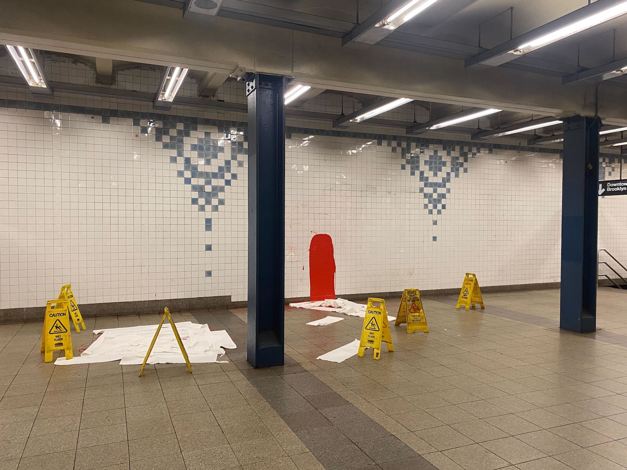 Red paint was splashed on the wall at Broadway-Lafayette, where Neely died, along with the text “Eric Adams, you have blood on your hands.”