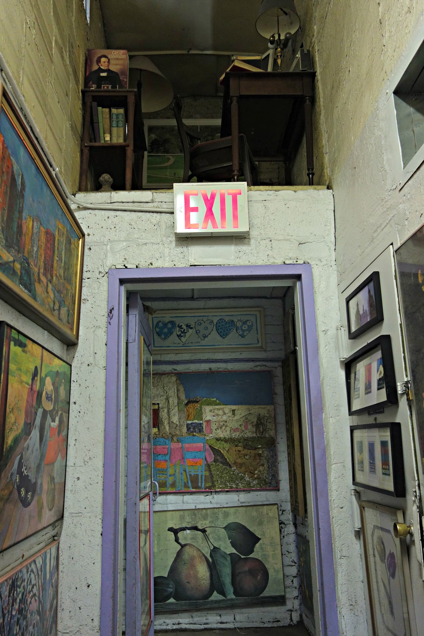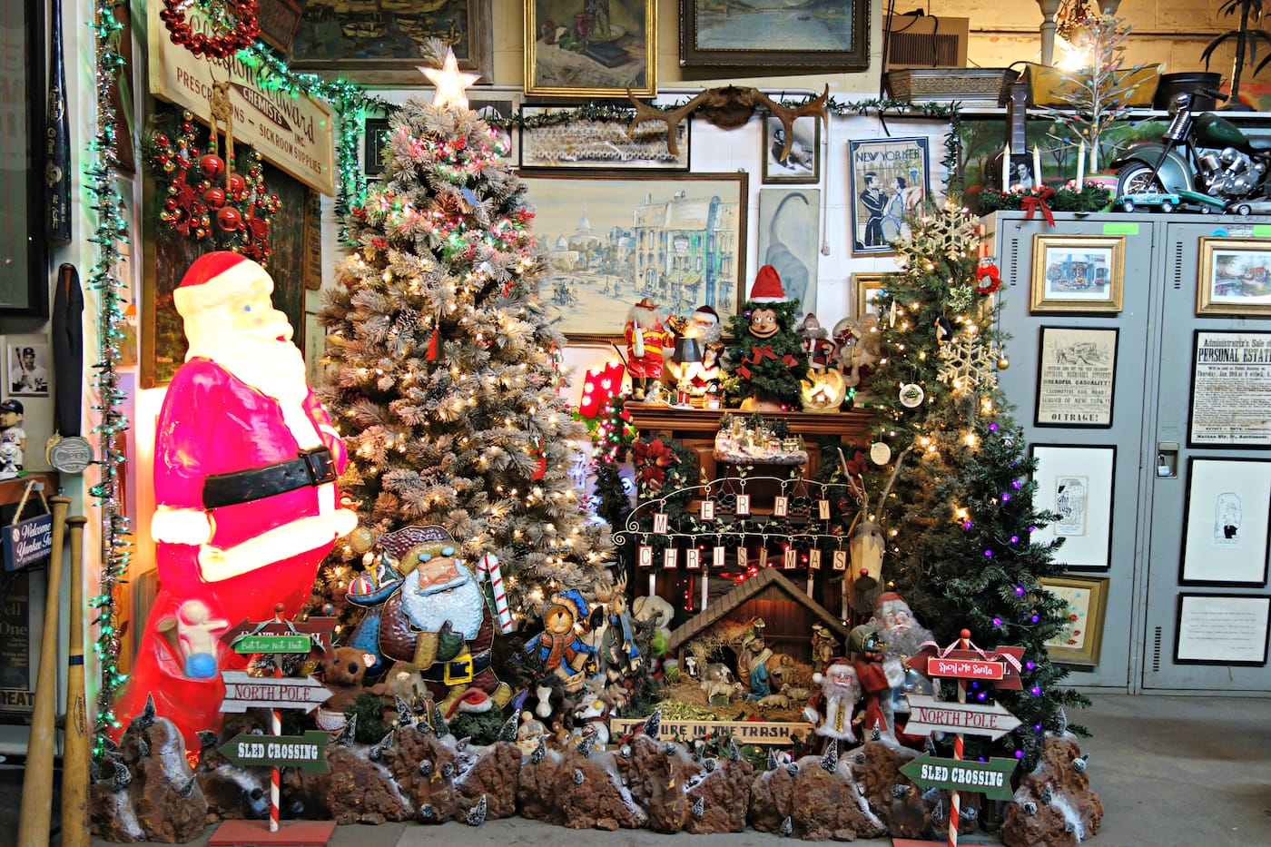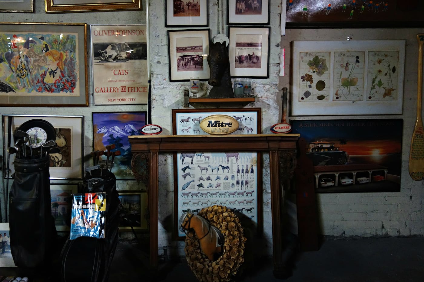 A few items were discovered by fellow sanitation workers, although Molina maintains final say on whether something will be installed. Now retired, he still comes in three days a week to the museum. “I’m always rearranging things here,” he said. And it’s that curating, juxtaposing, and sorting through decades of detritus that makes the museum more than just an Ali Baba’s cave of consumerism. Humorous touches include a huge mounted fish eating a plastic shark, a display of real war heirlooms presided over by a toy tank, a garland draped over the neck of a tiny horse, as if it had won a race, and a stuffed fox hiding among the plastic Christmas trees. A silent film projector is set up on one table, while signed baseballs, a jumble of stopped clocks, lines of doorknobs, and an array of glassware ordered by color rest nearby. Some pieces are heartbreakingly personal, like a clock engraved with the words, “Steve, wishing you great success. Love, Kevin and Amy.” Absolutely every possible space is used, starting with a fake rat in a cage on the staircase leading up to the museum. A compact office is even nestled in an alcove above the exit sign, complete with lamp and radio.