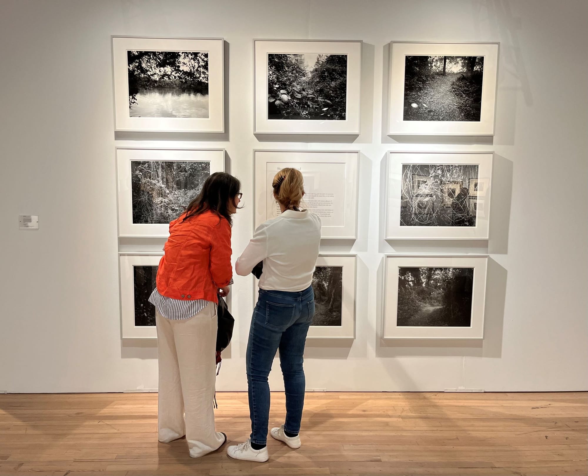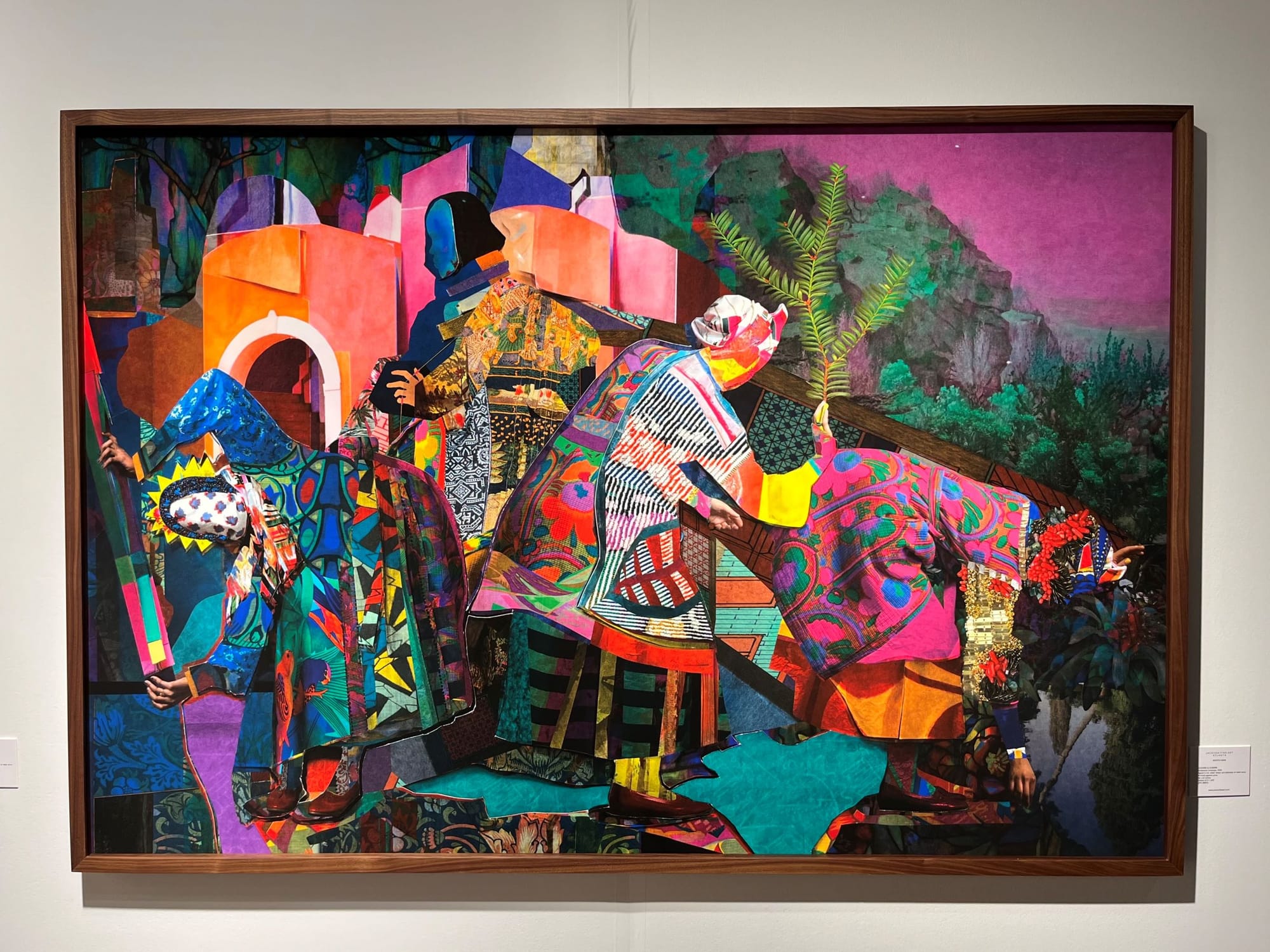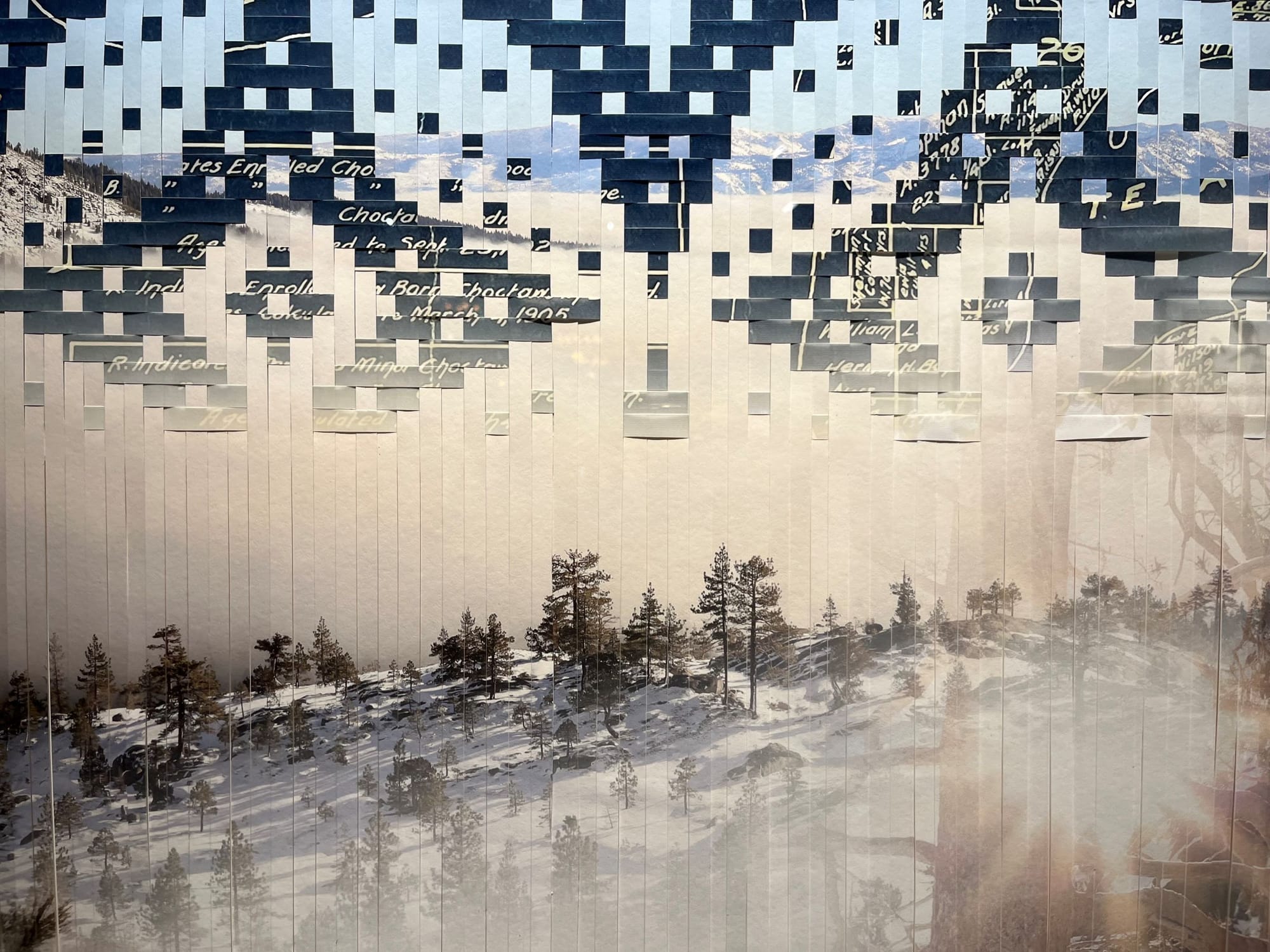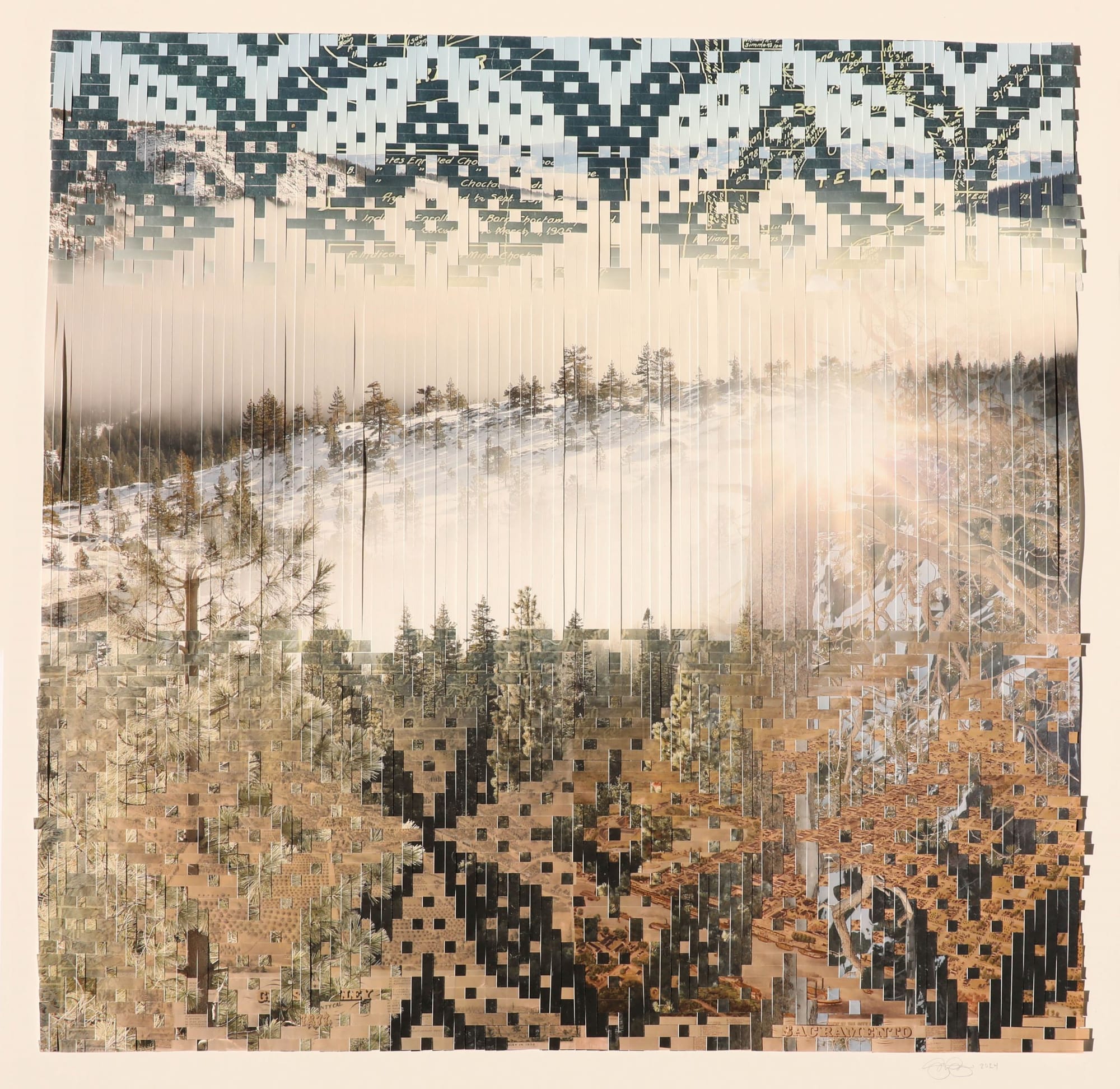 Visitors are immediately met by Sarah Sense’s woven photographs at the entrance-facing booth of Bruce Silverstein Gallery. A member of the Chitimacha Tribe of Louisiana and the Choctaw Nation, Sense weaves contemporary images of Oklahoma with historical maps and manuscripts, entangling the histories that shaped her family’s reservation into physical representations of the ever-present nature of colonial violence. Lewis and Clark’s travel journals and a 1902 allotment map are folded into scenic landscape photographs, all arranged in the pattern of a traditional basket created by the artist’s great-great-grandmother.