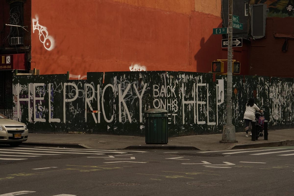 A Lower East Side woman was arrested yesterday, April 16, after painting a message seeking help for an unhoused friend on a green construction fence barricading an empty lot. The Village Sun reported that 57-year-old Helena Münninghoff, a formerly unhoused resident of the neighborhood, had painted the words "HELP RICKY ... BACK ON HIS FEET" at the corner of Third Street and Avenue C in Manhattan in support of her friend, Ricky Cole, who is recovering from spinal surgery and in the process of regaining his mobility.