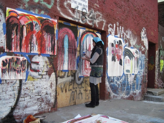 She explains that the incident has been a learning experience for her. “I’m learning that Brooklyn courts are very tough on graffiti. They’re cracking down in a big way. It’s unfortunate that I got caught up in that — because I was definitely not making graffiti. I was painting on my own paper. There were no spray cans, no stencils, no paint markers — just watercolors and two tiny watercolor brushes — which they confiscated as ‘graffiti materials.’ What I’ve learned is — the moment they call it graffiti — you are screwed. If you so much as put a sticker on a building — you’re screwed.”