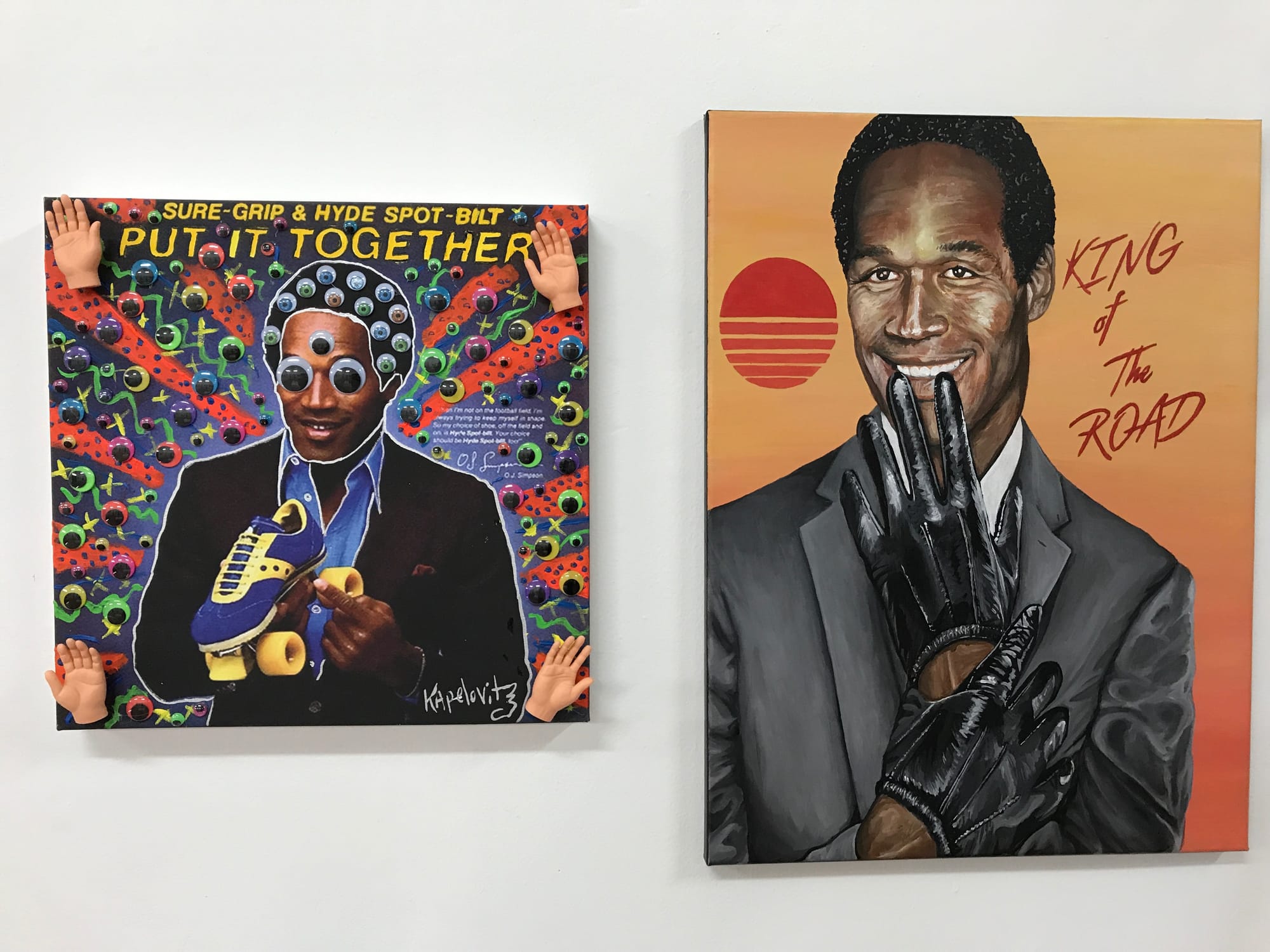 Riding this wave of interest, a pop-up exhibition of O.J. memorabilia and art opened over the weekend at Chinatown’s Coagula Curatorial. The O.J. Simpson Museum, curated by self-described O.J. expert Adam Papagan, features original artwork by various artists, related T-shirts and media dating back to the time of the trial, and other merchandise that captures the mania around the case. It may be obvious to point out what this “museum” is not: a tasteful or critical overview of the O.J. Simpson story with nuanced takes on the intersection of race, culture, and celebrity. For those things, you’re better off watching the aforementioned documentary, directed by Ezra Edelman, or reading Birth of a Nation’hood: Gaze, Script, and Spectacle in the O.J. Simpson Case, an anthology of essays by the likes of Toni Morrison and Kimberlé Williams Crenshaw.