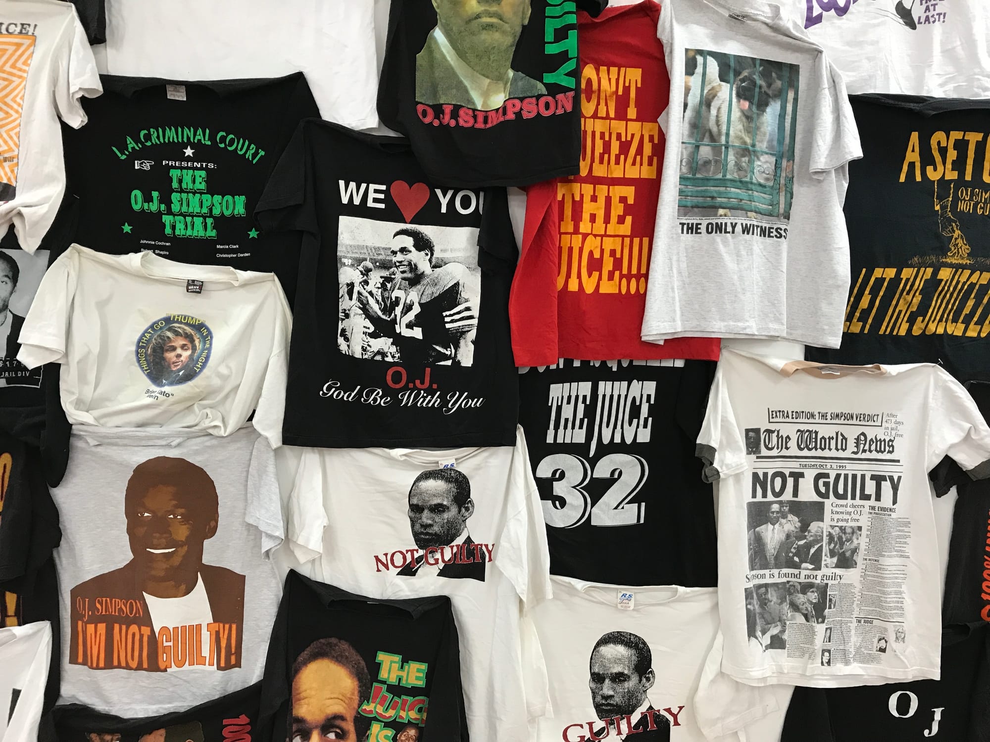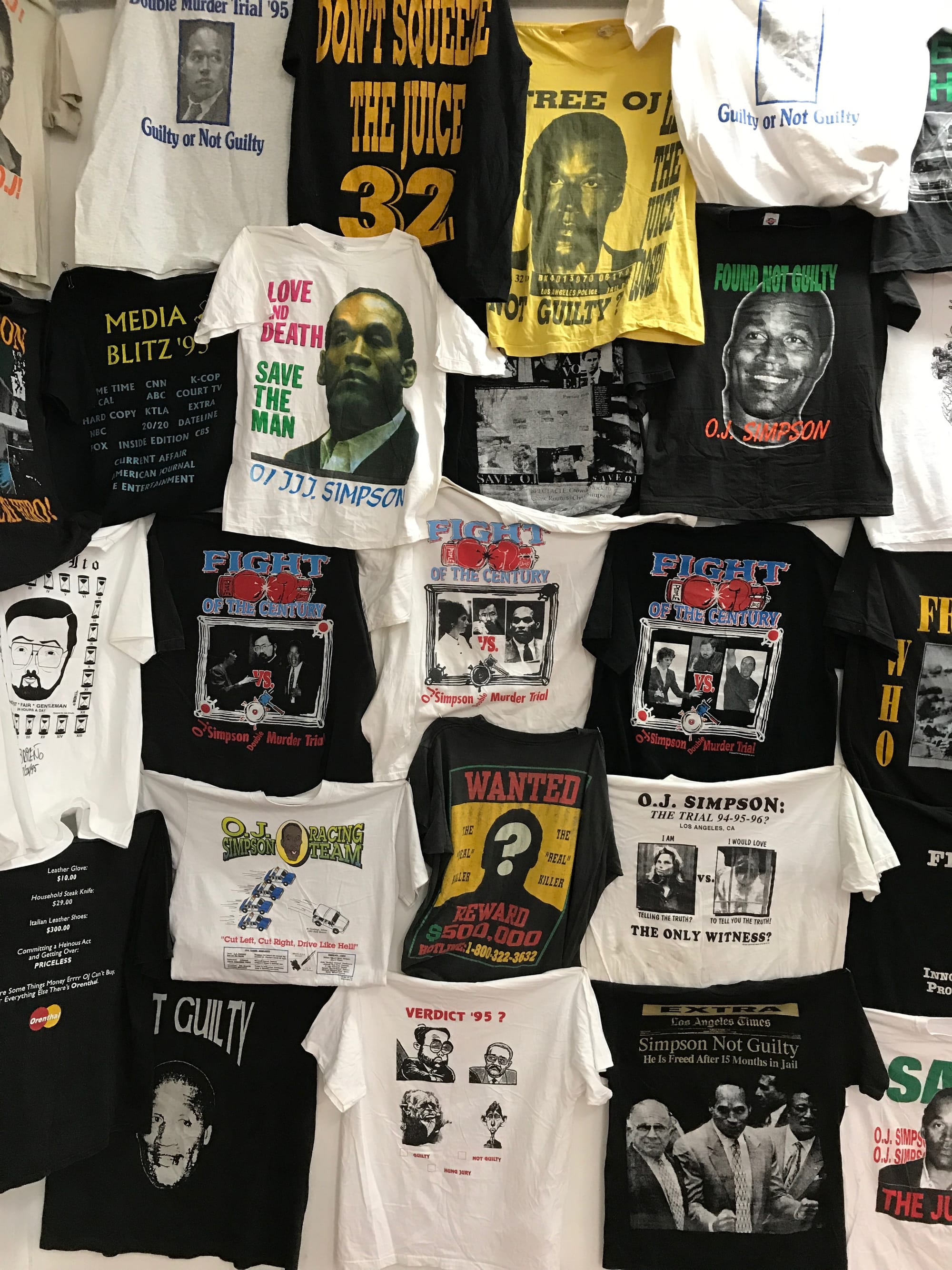 The sheer amount of homemade T-shirts on display at Coagula is impressive, serving as an extensive catalogue of hot takes and polemics from the time of the trial, before blogs or social media could broadcast people’s opinions, especially in the form of memes. These bootleg shirts capture a sense of how much the O.J. trial was a part of popular discourse and how anonymous individuals participated in the yearlong spectacle and expressed their closeness to its events and characters.