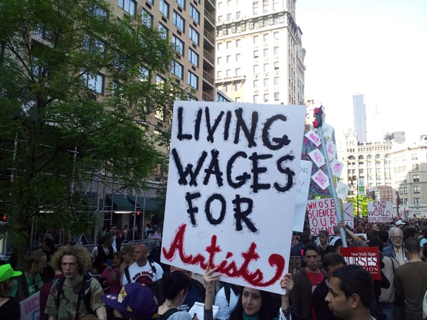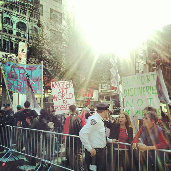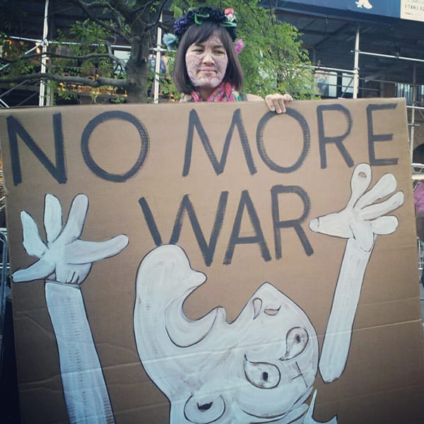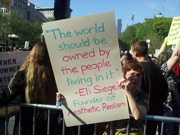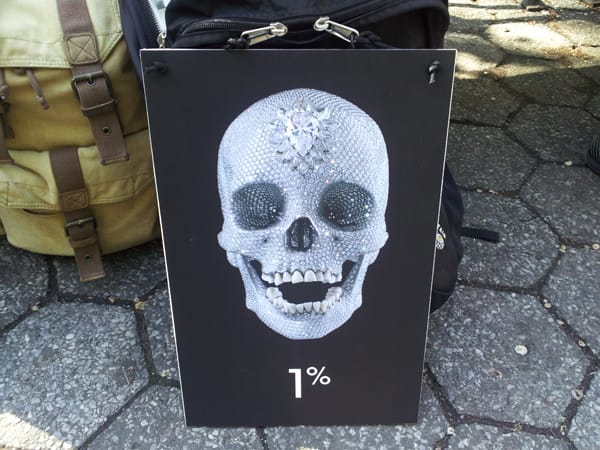 At around 3pm, Union Square swelled far beyond the capacity of Zuccotti Park, which made it possible for many different pockets of people to develop and do their own thing. Of course, there were drum circles, plural, and anarchist pamphleteers — common staples of Occupy Wall Street, but their presence was rivaled by a big brass band stand, the orations of a poetry assembly and the deafening silence of group meditation. And, how could I forget the Occupy Arts and Labor group, whose colorful fabric banners and hand painted posters provided a much appreciated dose of creativity, among the multitude of cardboard and marker signs.