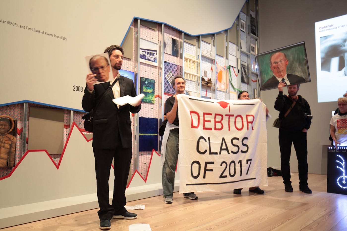 But there is another reason why the crowd might have been a bit larger than usual: people had been invited to attend a commencement ceremony on the fifth floor. Informed by email, social media, and word of mouth, they were instructed to show up at 7:30pm to listen to members of the “Class of 2017” offer addresses in front of a biennial art installation called “Debtfair,” a multimedia infographic that was created by the collective Occupy Museums.