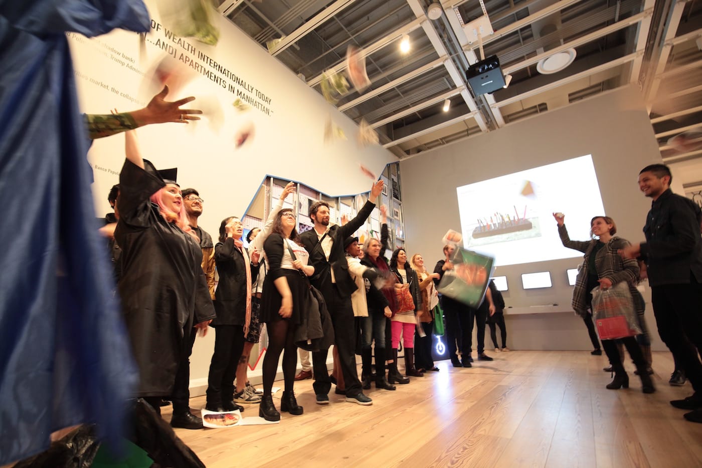 The counter-commencement featured some 40 “students,” some in traditional graduation caps and gowns who would later reveal their naked bodies covered with green, black, and white paint, and stuck with fake $100 bills. Museum staff did not intervene, as they permitted the participating artists to hold the floor as 21 of them gave speeches for 90 minutes without interruption. Carmelo Cintrón, a student at the University of Puerto Rico, addressed the Puerto Rican economic crisis, providing context and explaining how students and artists are impacted. Occupy Museums member Noah Fischer gave a longer commencement address that reached back to the 2008 economic crisis and concluded, “We are already leveraging the rest of your life…. Congratulations!” The evening concluded with all participants throwing money in the air.