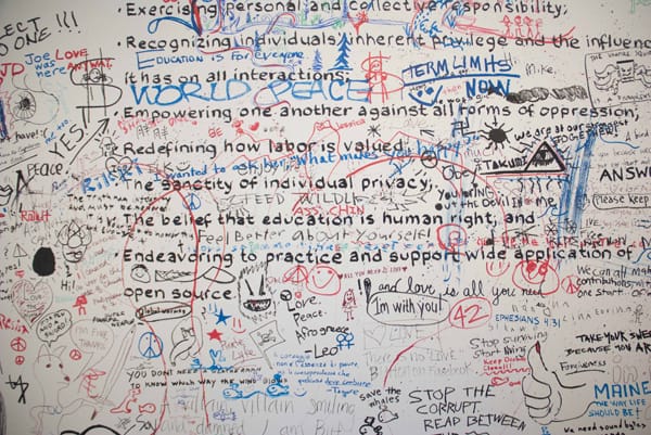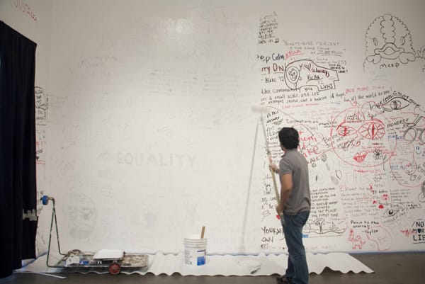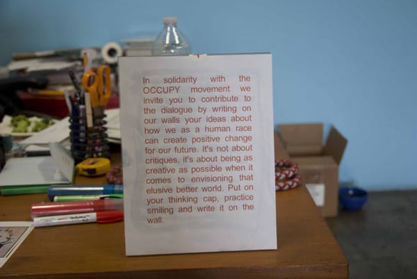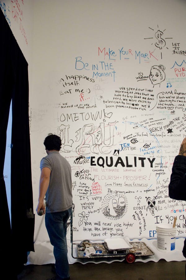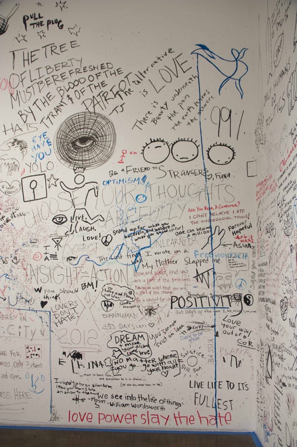 Occupy Track 16 was a solidarity movement put on by Track 16 gallery at Santa Monica’s Bergamot Station. It asked anyone who dropped by the gallery to “write on our walls your ideas about how we as the human race can create positive change for our future.” It continues, “It’s not about complaints … it’s about being as creative as possible when it comes to envisioning that elusive better world. Put on your thinking cap, practice smiling, and add your vision to our walls!”