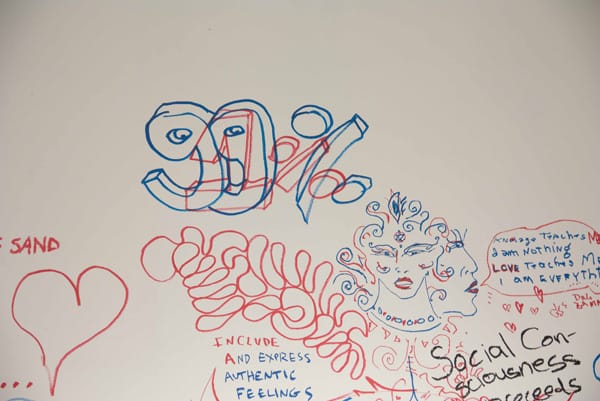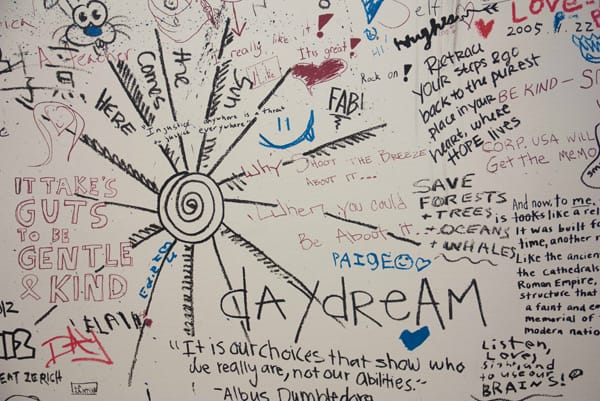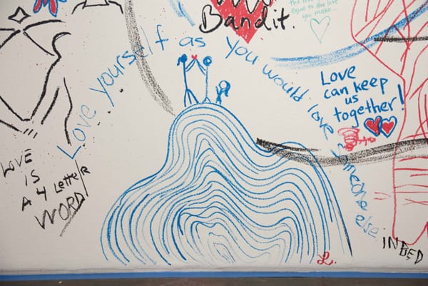 In three months, Track 16’s massive space was filled with scrawls, epithets, words of wisdom that glowed with positivity like “love can keep us together,” “love yourself as you would love someone else” or “be here now.” Some contented themselves with whimsical line drawings of rocket ships blasting off in space, angry bears or vaguely leaf-like flourishes.