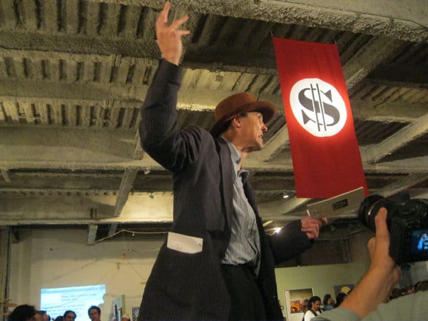In one pop-up performance piece, a man from New Jersey who calls himself Art O’Connor read a mock letter he wrote as a frustrated artist to the banks who have screwed him over. His act was a mixture of frightening rage and vaudeville comedy. Dressed in a tattered suit and roaring from a make-shift soap box, O’Conner looked like he belonged in a Broadway show about the Great Depression.